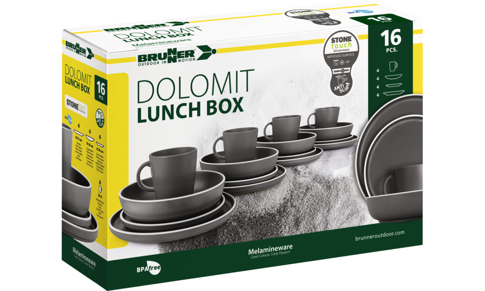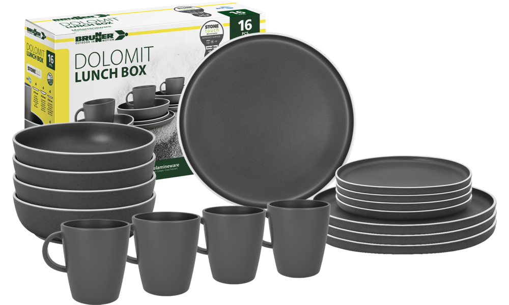 16-teiliges Melamin-Set bestehend aus 4 Esstellern ø 25 cm, 4 Desserttellern ø 20 cm, 4 Suppentellern ø 20 cm und 4 Henkelbechern 30 cl.