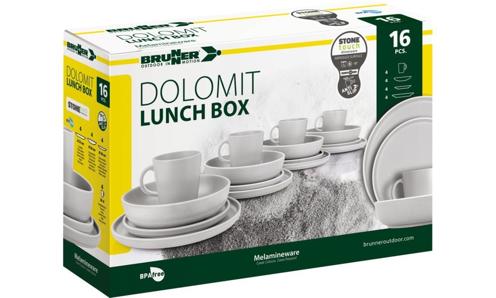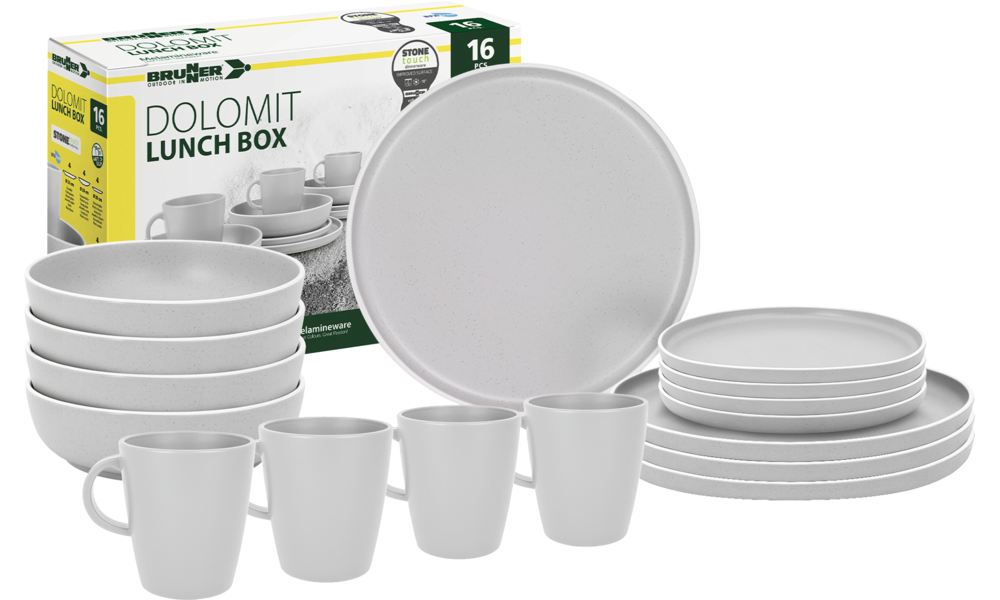 16-teiliges Melamin-Set bestehend aus 4 Esstellern ø 25 cm, 4 Desserttellern ø 20 cm, 4 Suppentellern ø 20 cm und 4 Henkelbechern 30 cl.