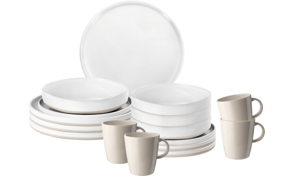 16-teiliges Set bestehend aus 4 Esstellern ø 26 cm, 4 Suppentellern ø 21 cm, 4 Desserttellern ø 19 cm und 4 Henkelbecher 0,3 l.
