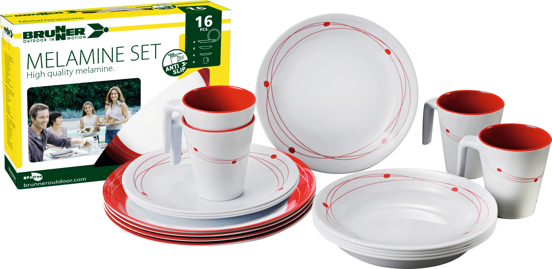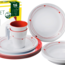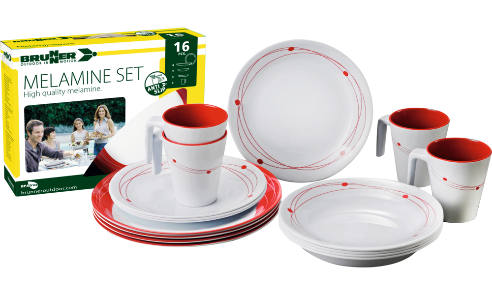 Melamin-Set COSMIC. 16-teiliges Geschirrset aus hochwertigem Melamin. Spülmaschinenfest, lebensmittelecht und bruchunempfindlich. Nicht mikrowellengeeignet. Bestehend aus 4 Esstellern ø 25 cm, 4 Suppentellern ø 21 cm, 4 Desserttellern ø 20 cm und 4 Henkelbechern 30 cl.