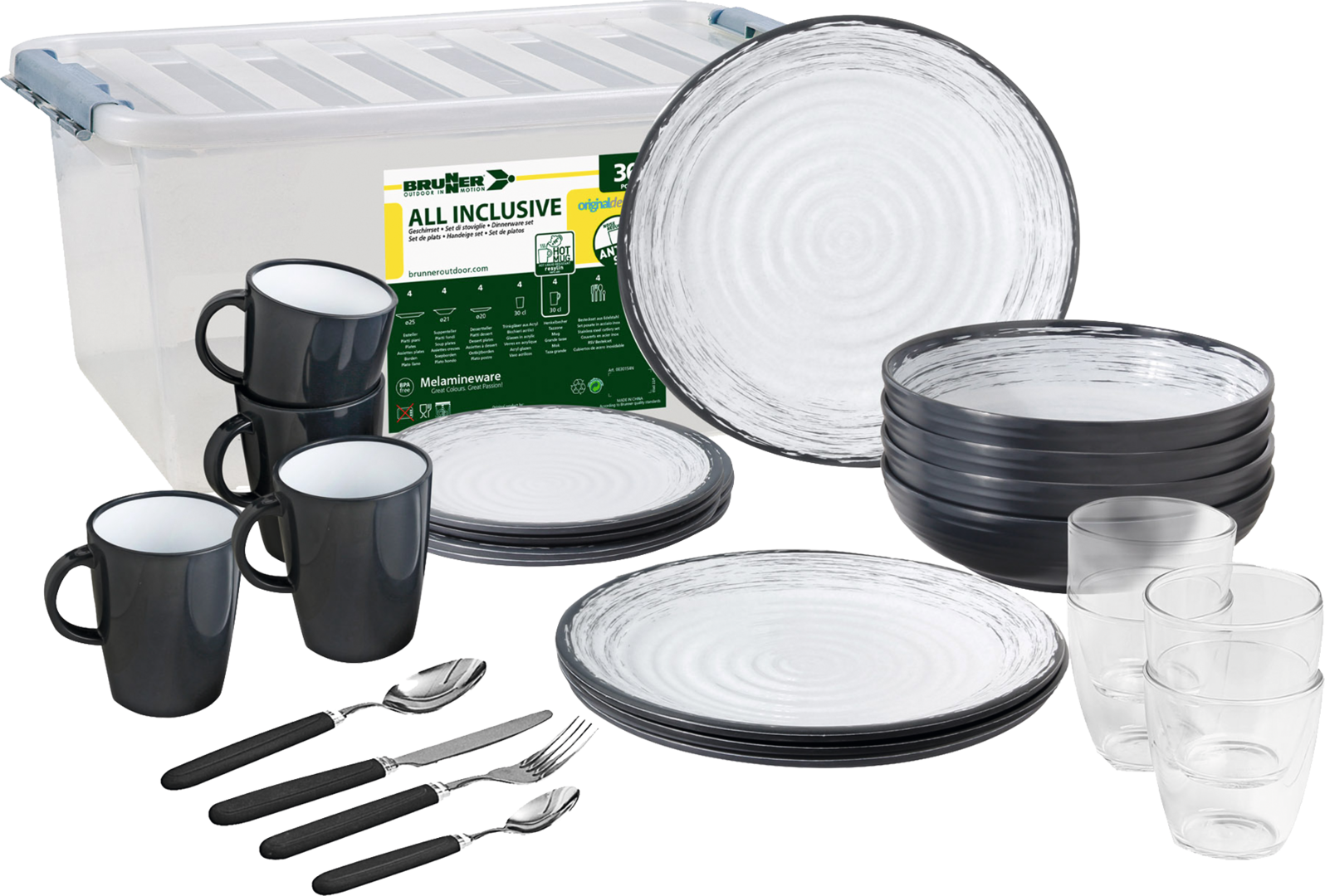 All Inclusive GRANADA. 36-teiliges Set bestehend aus 4 Esstellern ø 26 cm, 4 Suppentellern ø 21 cm, 4 Desserttellern ø 21 cm, 4 Henkelbechern 0,3 l, 4 Bechern 0,2 l und 16-teiligem Besteckset (je 4 x Löffel, Gabel, Messer, Teelöffel).