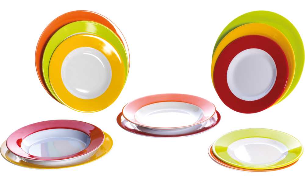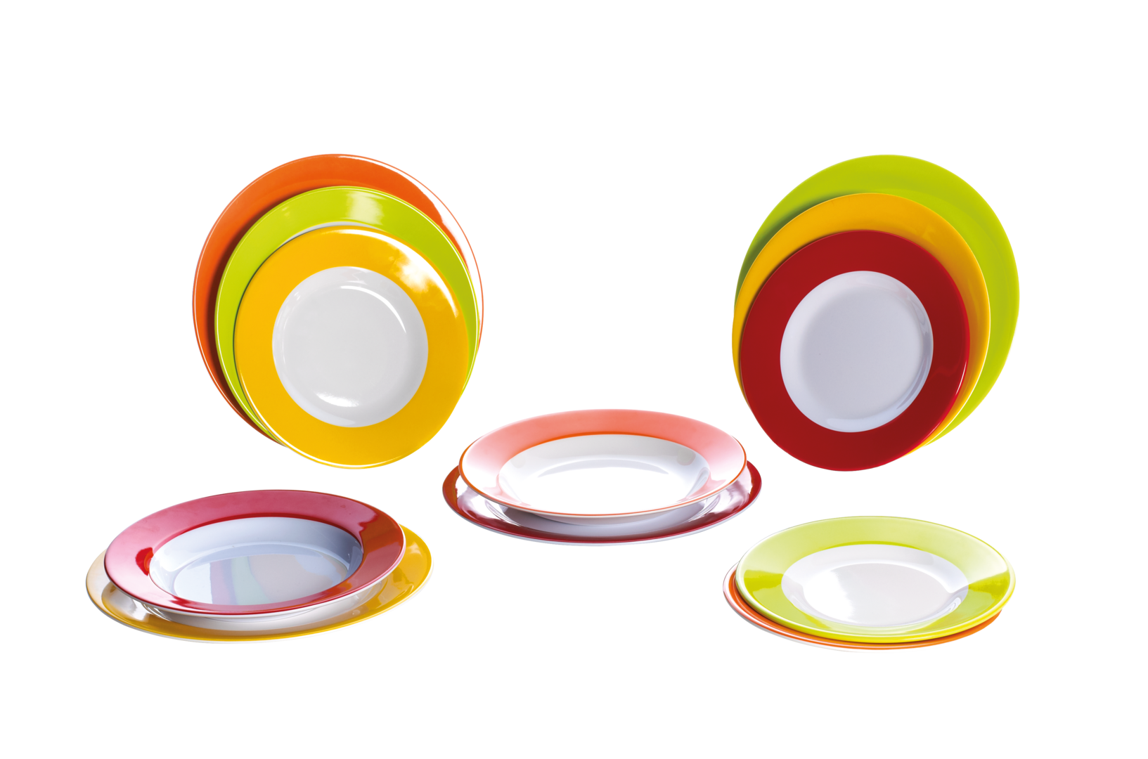 Melamin-Set RAINBOW. 12-teilig. Hochwertiges Geschirr bestehend aus 4 Desserttellern, 4 Suppentellern und 4 Esstellern. Nur solange Vorrat reicht!