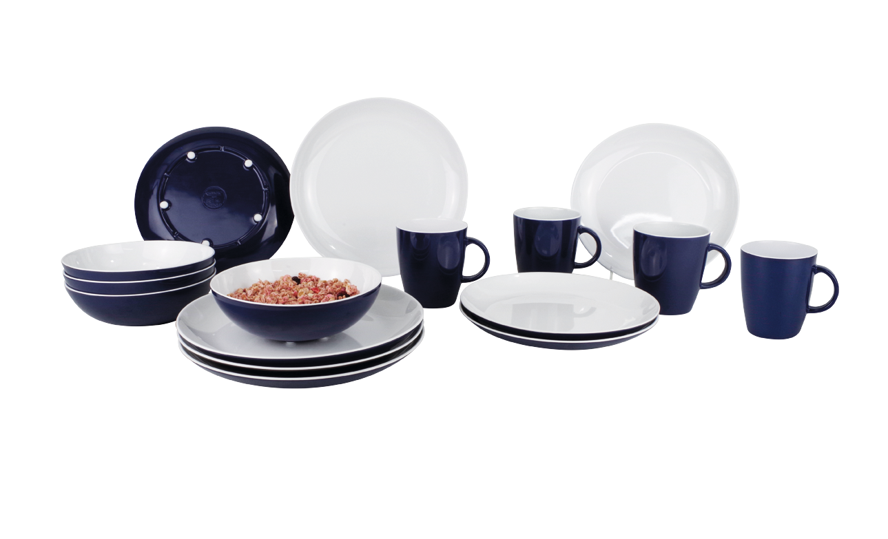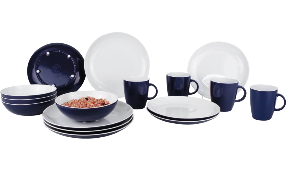 Classic Line Serie Navy Blue. Melamin-Set. 16-teiliges Set, bestehend aus 4 Esstellern, 4 Desserttellern, 4 Schalen und 4 Henkelbechern. Nur solange Vorrat reicht!