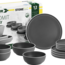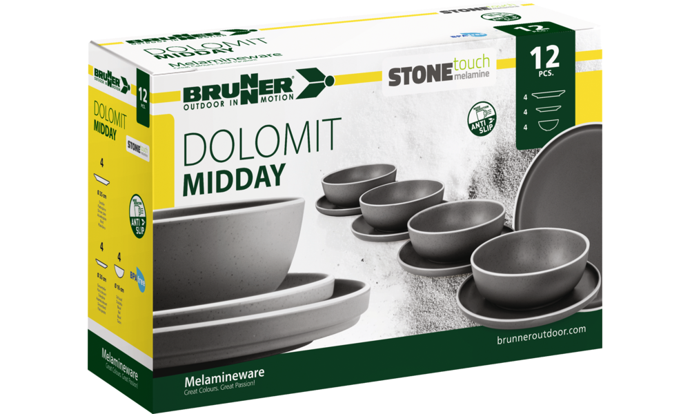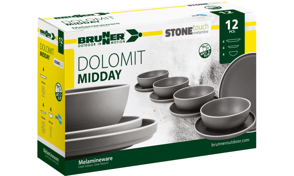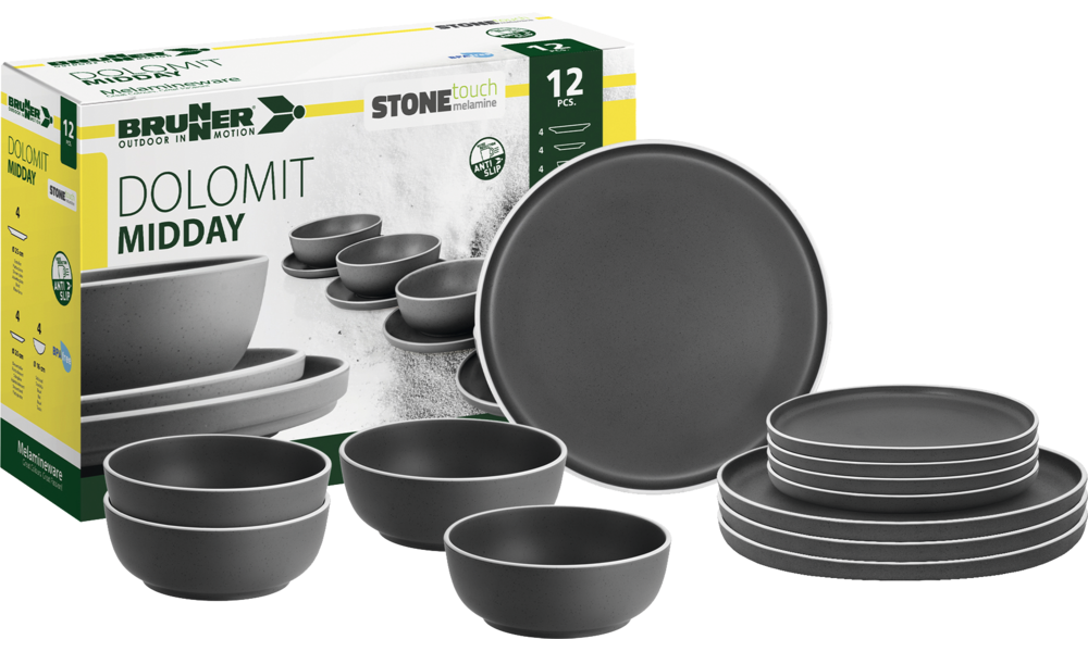 12-teiliges Melamin-Set bestehend aus 4 Esstellern ø 25 cm, 4 Desserttellern ø 20 cm und 4 Schüsseln ø 16 cm.