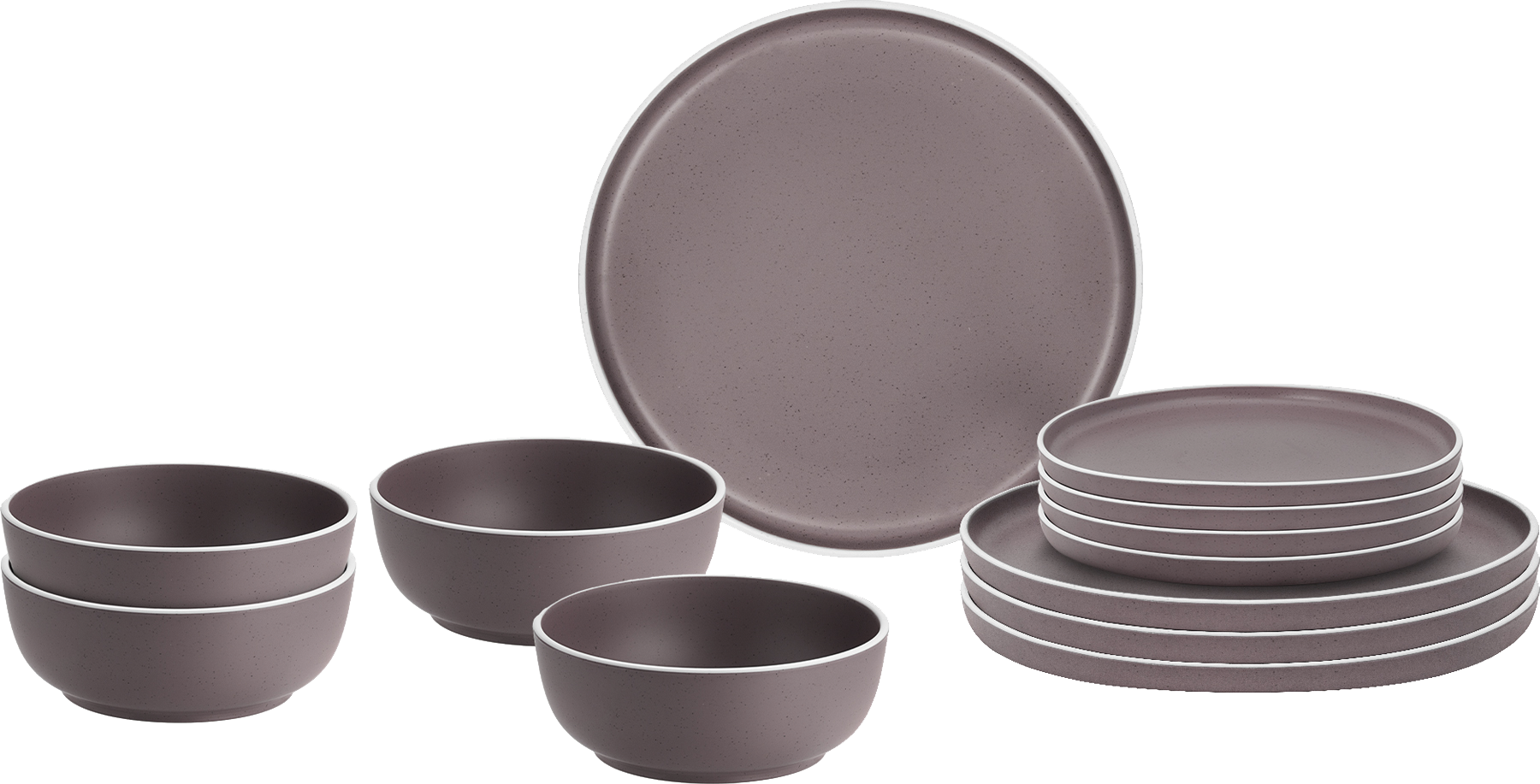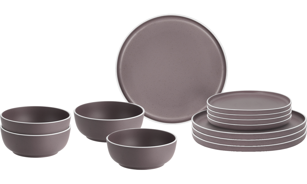 12-teiliges Set bestehend aus 4 Esstellern ø 26 cm, 4 Desserttellern ø 21 cm und 4 Schüsseln ø 15 cm.