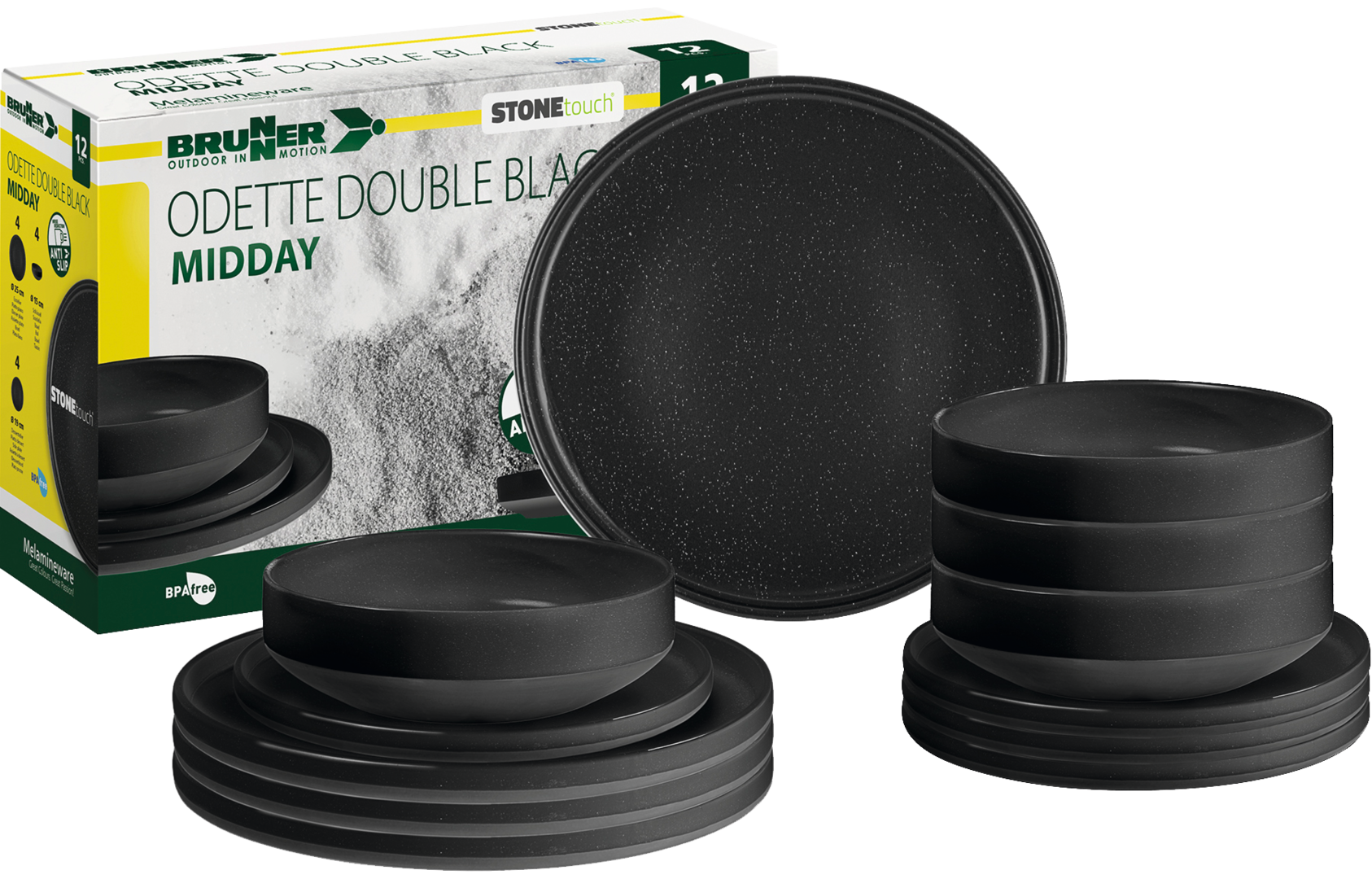 12-teiliges Set bestehend aus 4 Esstellern ø 25 cm, 4 Desserttellern ø 19 cm und 4 Schüsseln ø 15 cm.
