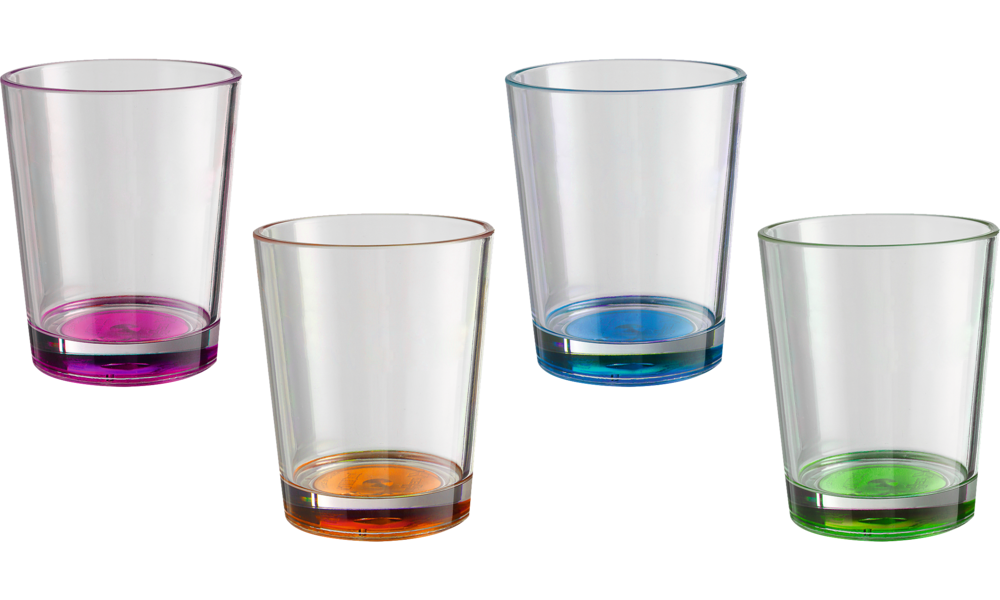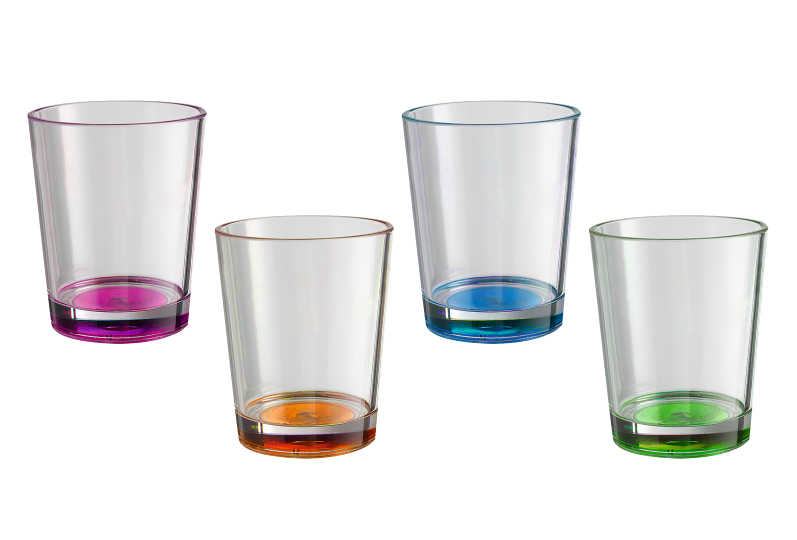 Multiglass-Set COLOR Antislip. Schönes Trinkglas mit optisch ansprechender, farbiger Basis und praktischem Antislip-Ring. Platzsparend stapelbar. Material: Hochwertig verarbeitetes, lebensmittelechtes SAN. Farblich sortiert. Volumen je 30 cl. 4er Set.