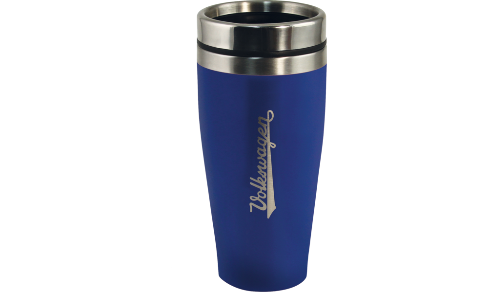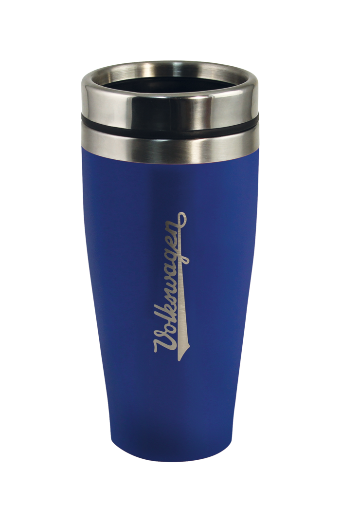 Doppelwandige Vakuum Thermosflasche oder Thermobecher aus hochwertigem Edelstahl 18/8 mit Volkswagen Schriftzug und VW Logo, herausgelasert aus einer robusten einfarbigen Pulverbeschichtung.
