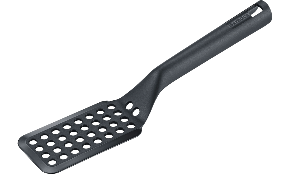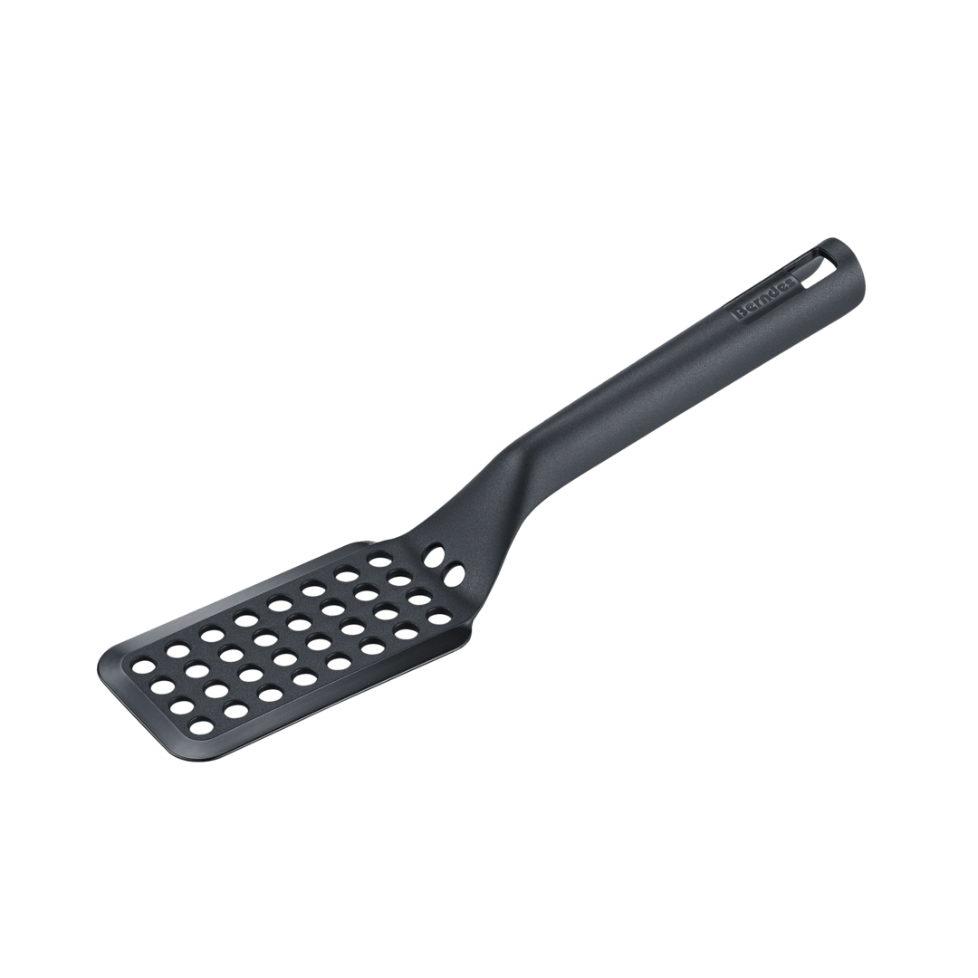 Durch die flache Form ist er ideal, um auch bei kleinen Pfannengrößen unter das Gargut zu kommen. Dank der Löcher kann überschüssiges Fett abtropfen.