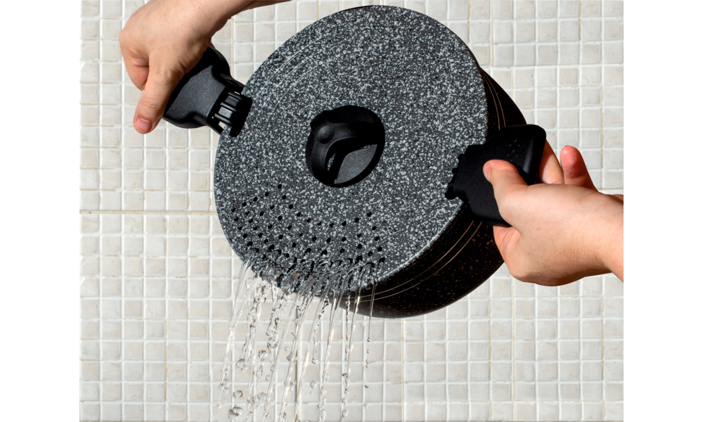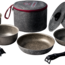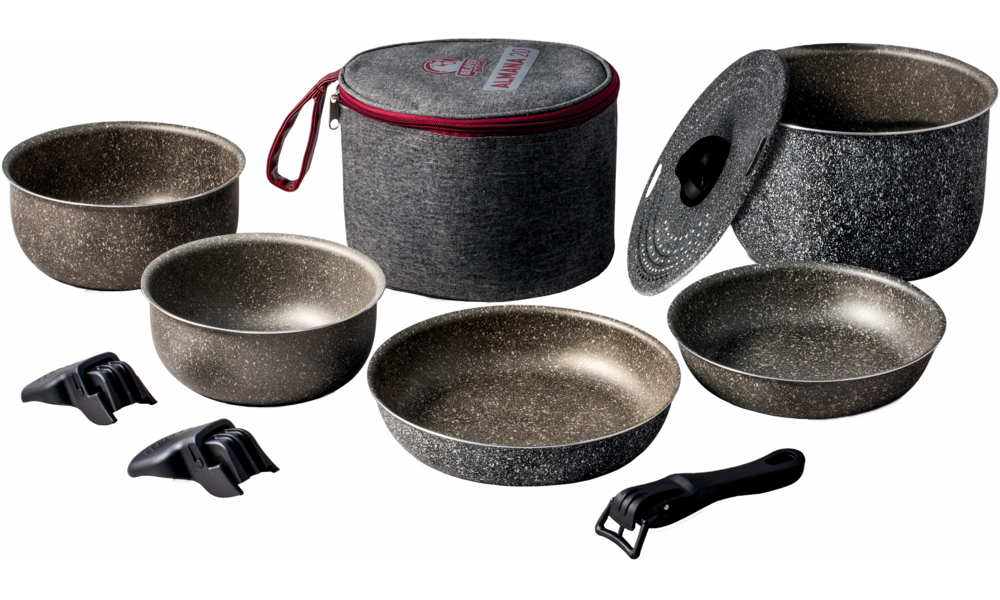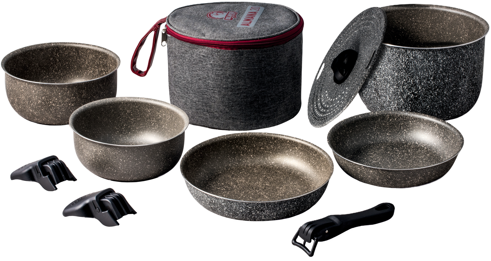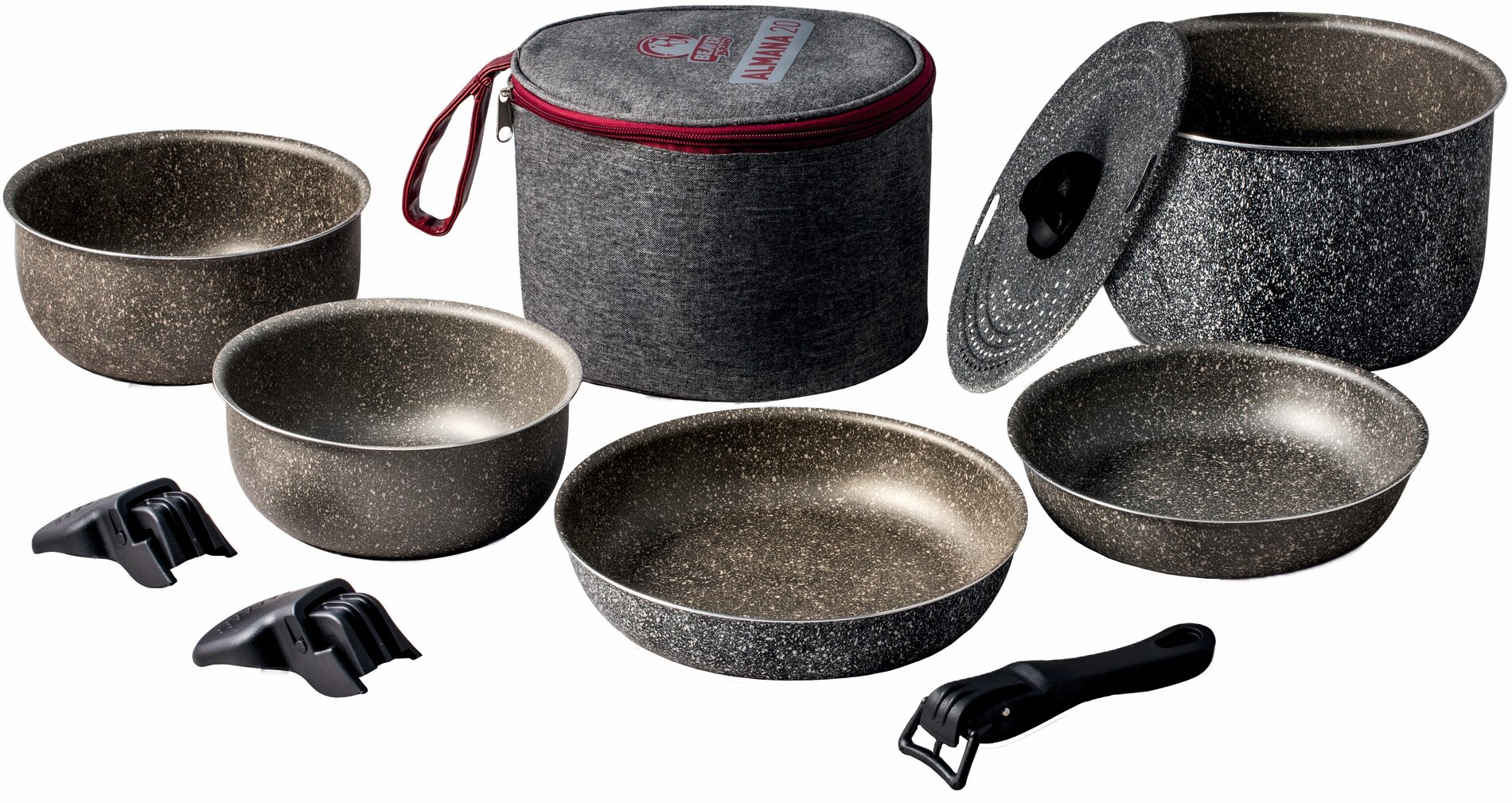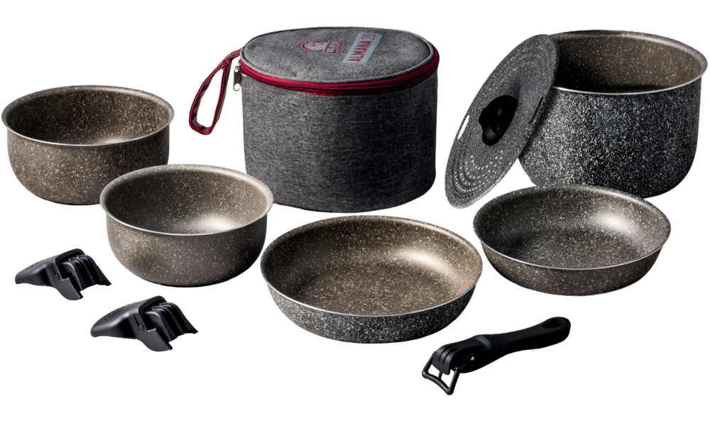 Kochtopfset ALMANA 20. Kochgeschirr aus 99,5 % Aluminium, lebensmittelecht und mit Antihaft-Beschichtung. Set bestehend aus 1 Topf ø 20 cm, 1 Topf ø 18 cm, 1 Topf ø 16 cm, 1 Pfanne ø 20 cm, 1 Pfanne ø 18 cm, 1 Deckel ø 20 cm, 1 Deckel ø 18 cm, 2 Topfgriffe, 1 Stielgriff und 1 Tasche. Geeignet für drei Personen.