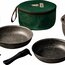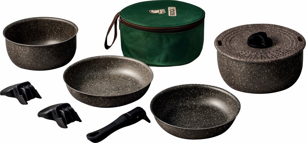 Kochgeschirr aus 99,5 % Aluminium, lebensmittelecht und mit Antihaftbeschichtung. 9-teiliges Set bestehend aus 1 Topf ø 20 cm, 1 Topf ø 18 cm, 1 Pfanne ø 20 cm, 1 Pfanne ø 18 cm, 1 Siebdeckel ø 20 cm, 1 Stielgriff, 2 Topfgriffen und 1 Tasche.