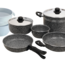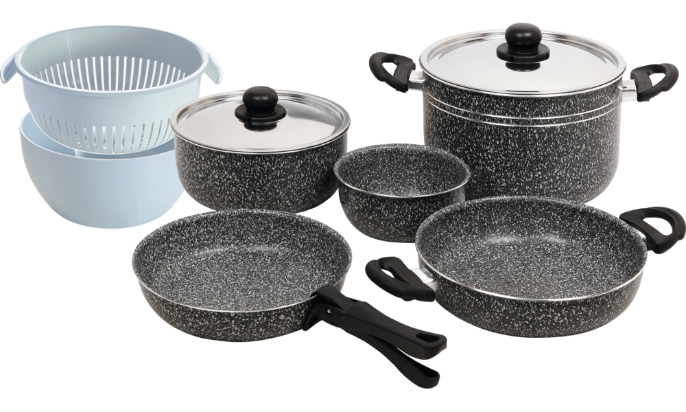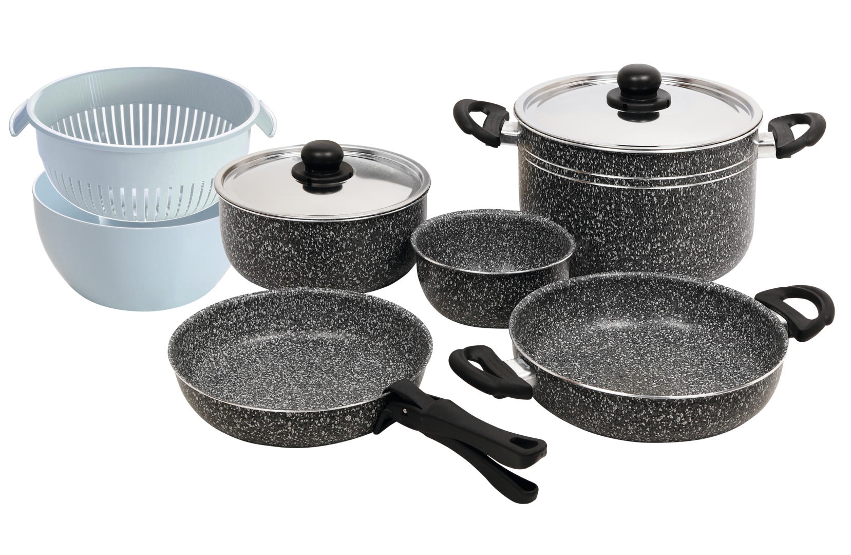 Kochtopfset STONE ROCK 24. Kochgeschirr aus 99,5 % Aluminium, lebensmittelecht und mit Antihaft-Beschichtung. 10-teiliges Set bestehend aus 1 Topf ø 24 cm, 1 Topf ø 20 cm, 1 Topf ø 16 cm, 1 Pfanne ø 24 cm, 1 Pfanne ø 20 cm, 1 Deckel ø 24 cm, 1Deckel ø 20 cm, 1 Pasta Sieb ø 24 cm, 1 Schüssel ø 24 cm und 1 Stielgriff. Geeignet für sechs Personen.