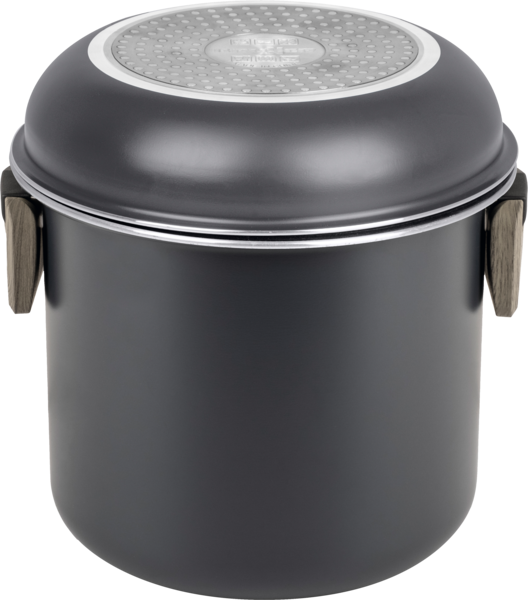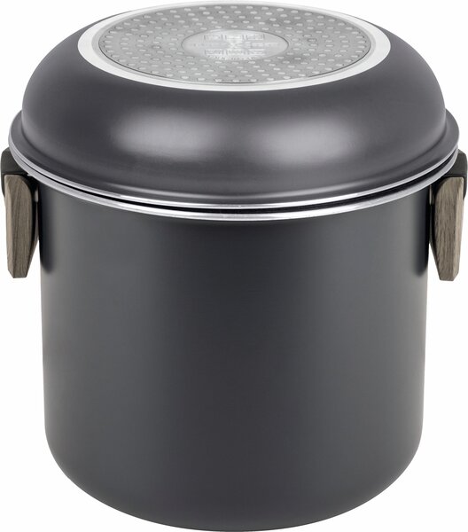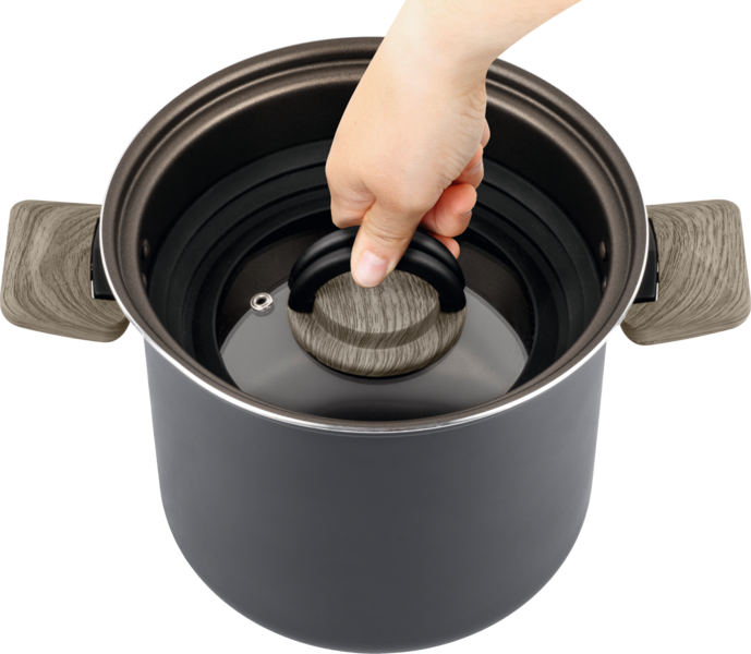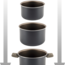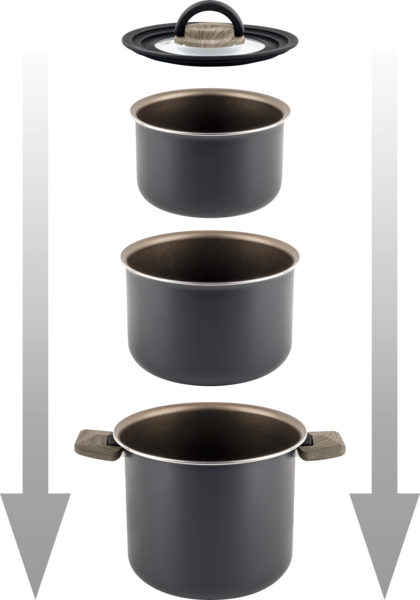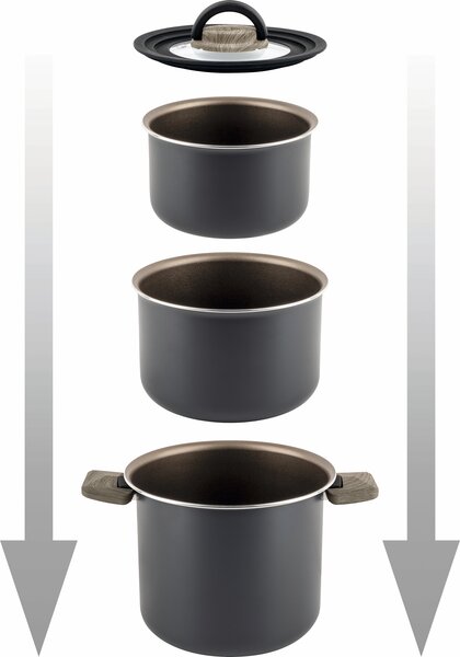 Set bestehend aus 1 Topf 18 / H 13 cm , 1 Topf 18 / H 5 cm, 1 Topf 14 / H 10 cm, 1 Deckel ø 20 / 18 / 16 cm, 1 Griffzange.