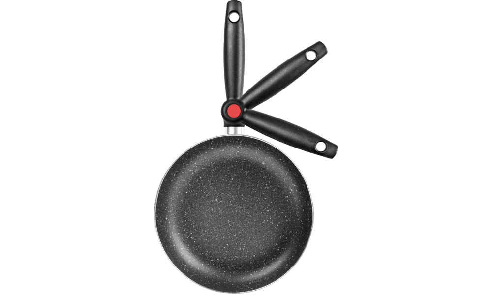 Hochwertige Aluminium-Pfanne mit Antihaft-Beschichtung. Dank patentiertem, klappbarem Griff platzsparend verstaubar.