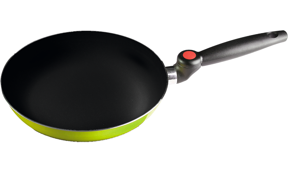 Hochwertige Aluminium-Pfanne, innenseitig mit Antihaft-Beschichtung. Dank klappbarem Griff platzsparend verstaubar.