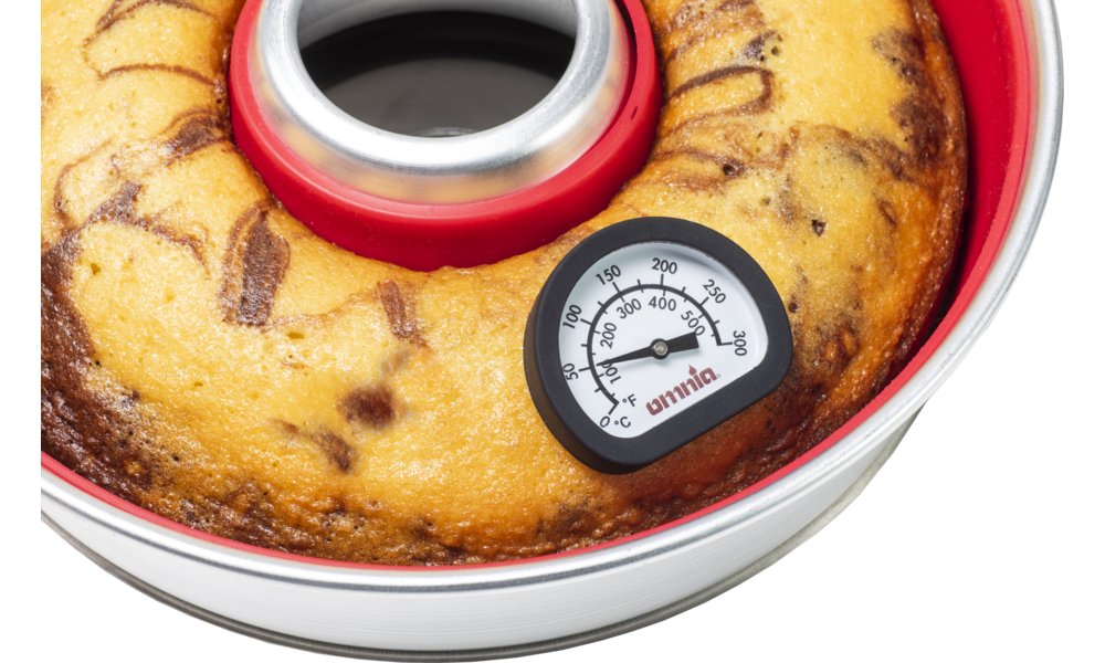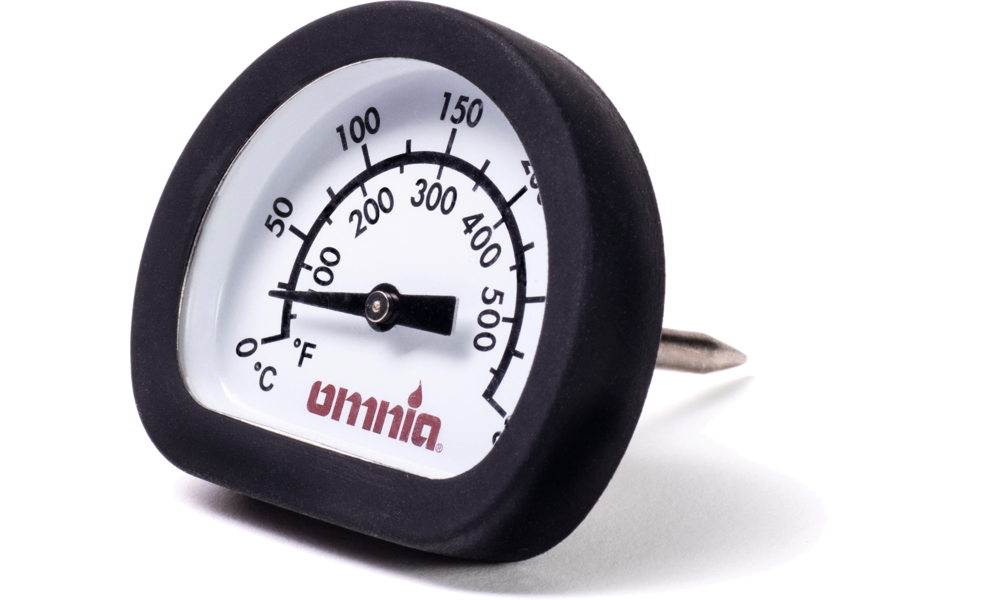 OMNIA Thermometer. Die Sonde ist spitz, wodurch die Kerntemperatur von Gebäck und Speisen während der Zubereitung leicht gemessen werden kann. Die maßgefertigte Form und die praktische Feststellschraube ermöglichen eine einfache Befestigung in einem der Löcher des Deckels, um die Temperatur im Ofen zu messen. Ebenfalls nutzbar als ein Fleischthermometer, indem man direkt im garenden Backgut die Kerntemperatur misst.