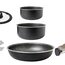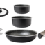 Aluminium-Kochtopfset mit Antihaft-Beschichtung, welches, dank des platzsparendem Klappgriffs am Deckel kompakt verstaubar ist. Induktionsgeeignet. Inklusive Pfannenschutz.