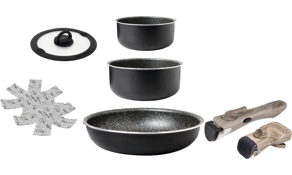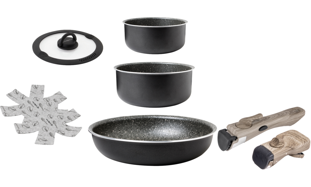7-teiliges Set bestehend aus 1 Pfanne ø 26 cm - H 5 cm, 1 Topf ø 22 cm - H 10 cm, 1 Topf ø 18 cm - H 9 cm, 1 Deckel ø 22 cm, 1 kurzer Griff, 1 langer Griff und 1 Tasche.