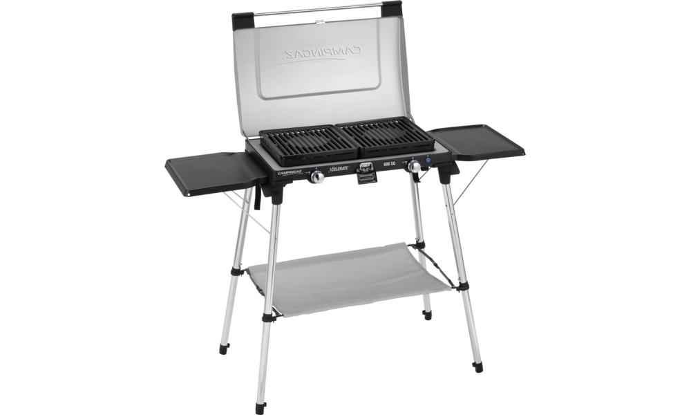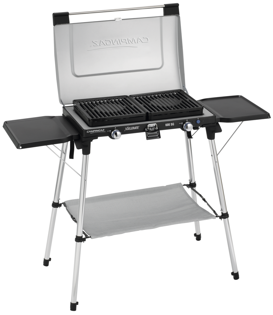 Xcelerate™ Kocher 600-SG. Die Linie tragbarer 2-Flammkocher von Campingaz® kombiniert ein modernes Design und eine innovative Technologie für eine herausragend verbesserte Kochleistung. Darüber hinaus bietet sie verschiedene Kochfunktionen in einem Gerät: z. B. Kochen oder Grillen. Der 600-SG hat eine Piezozündung für schnelles, sicheres Zünden. Das Spitzengerät hat ein Gestell mit teleskopierbaren Beinen, die für einfachen Transport am Boden des Kochers befestigt werden. Robuste Seitenablagen als Arbeitsfläche. Zwei abnehmbare Grillplatten mit Wasserschale ermöglichen auch gleichzeitiges Kochen und Grillen. Betriebsdruck 50 mbar. Leistung 2 x 2.200 W. Gasverbrauch 2 x 165 g/h.