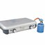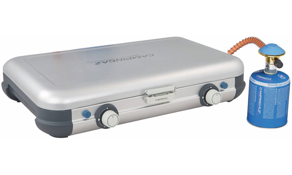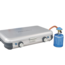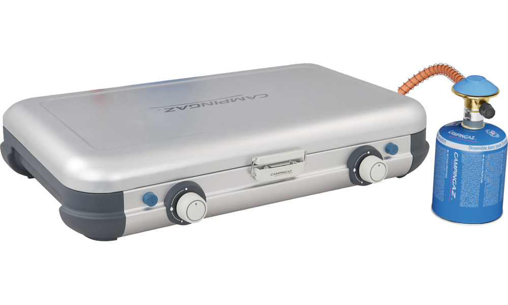 Camping Kitchen™ Grill & Go CV. Edelstahl-Kochfeld, Deckel aus lackiertem Stahl, Knöpfe aus Kunststoff. Plancha und Grillplatte aus emailliertem Stahl mit Antihaftbeschichtung. Beide Brenner mit Piezo-Zündung. Betrieb mit Gaskartusche CV. Leistung 2 x 4.000 W. Gasverbauch 291 g/h. Abmessungen offen 49 x 45 x 33 cm, geschlossen 49 x 35 x 10 cm.