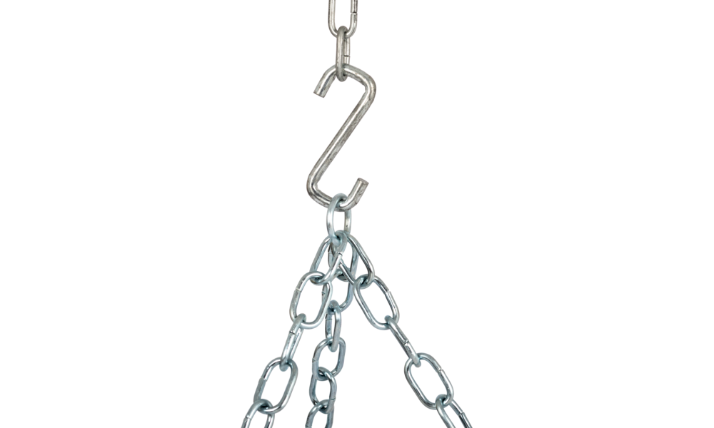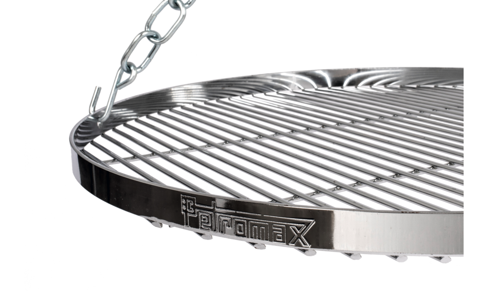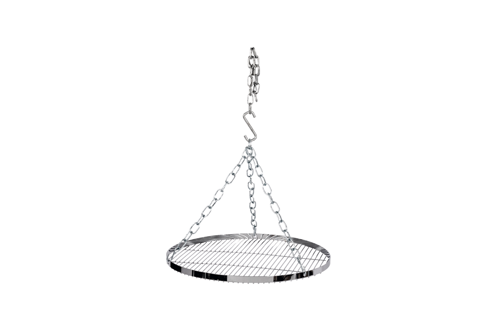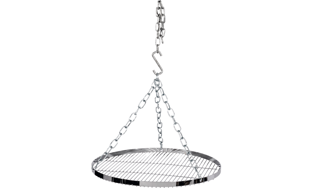 Mittels der drei stabilen Ketten wird der verchromte Stahlrost mit einem Handgriff an den Dreibeinhaken gehängt und ist direkt einsatzbereit.