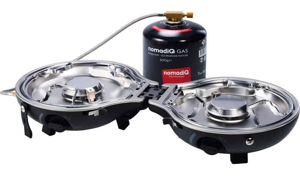 smarte NomadiQ-Gaskocher verfügt über zwei sehr leistungsstarke Brenner mit zwei unabhängigen Temperaturreglern