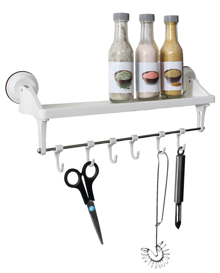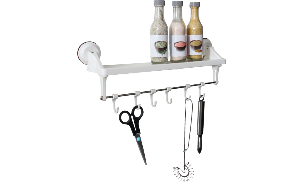 Hakenleiste mit 6 Haken und 2 Saugnäpfen mit zusätzlicher Abstellfläche. Haftet auf fast jedem Untergrund. Max. Tragkraft 3 kg.