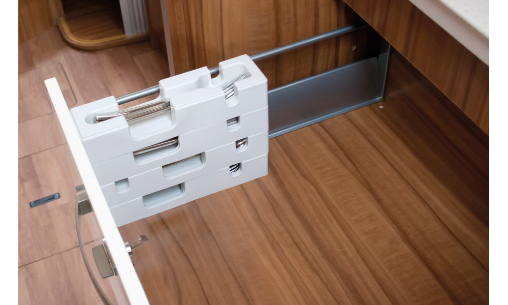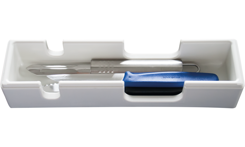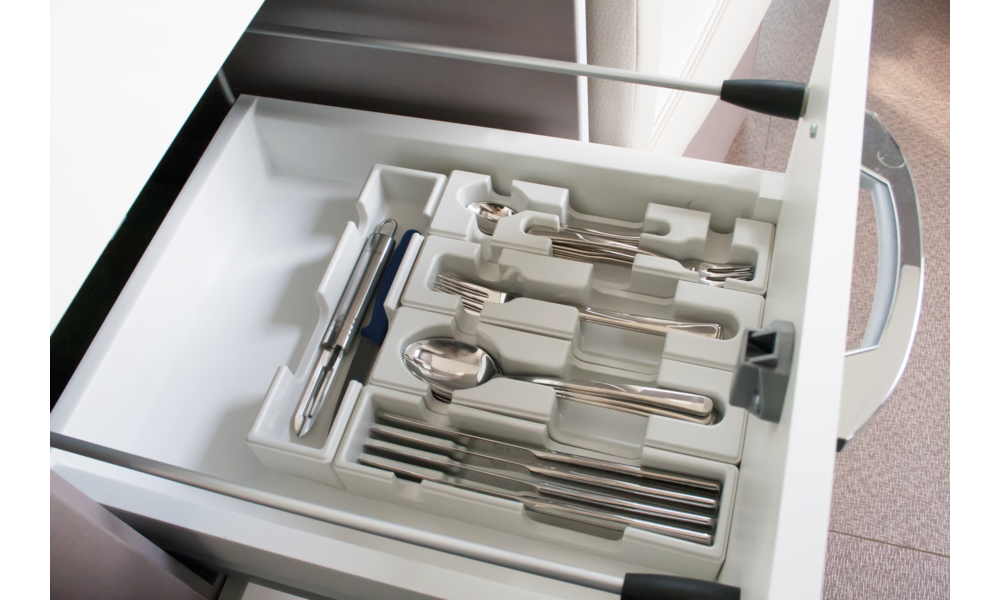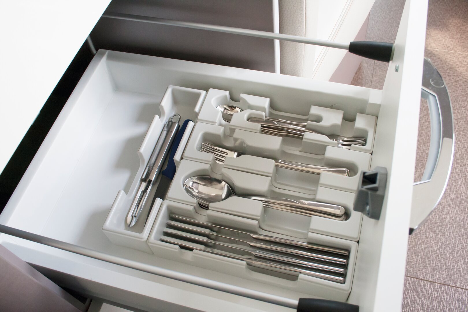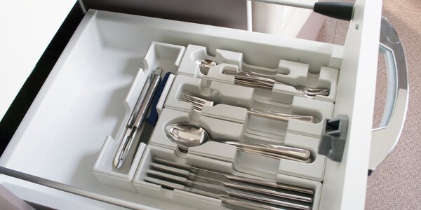 Stapelbare Besteckeinsätze, konturgenaue Führung des Bestecks.