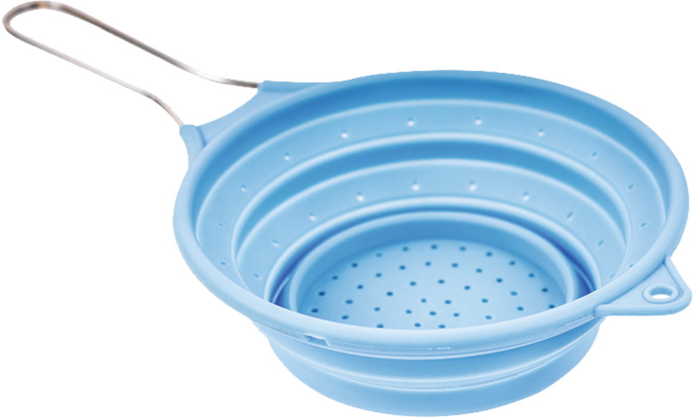 Platzsparend im gefalteten Zustand. Material Silikon, Griff Edelstahl.