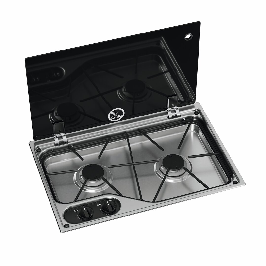 Die Dometic CVH 1525G Einbau-Kochmulde mit Abdeckung aus hitzebeständigem Sicherheitsglas wird mit einem 30 mbar Gasanschluss betrieben. Für mehr Sicherheit ist dieser Kocher mit einer praktischen Gasabschaltfunktion bei geschlossener Abdeckung ausgestattet. Zusätzlich ist der Einbauherd mit einem Sicherheitszündsystem und einer elektronischen 12-Volt Zündung versehen. Die beiden Brenner mit emaillierten Brennerdeckeln und Topaufsätzen haben eine Leistung von 1.100 Watt und 2.000 Watt.
