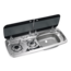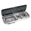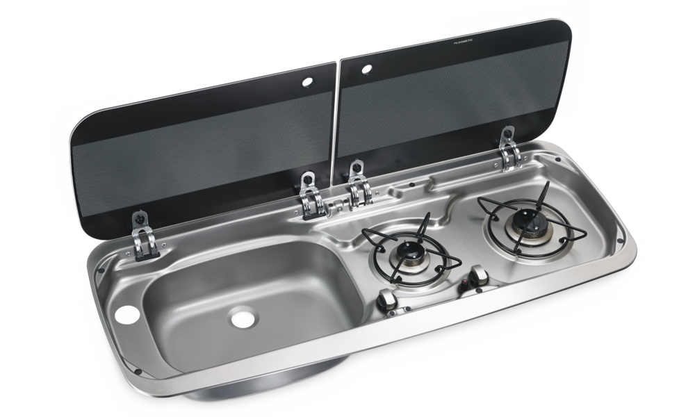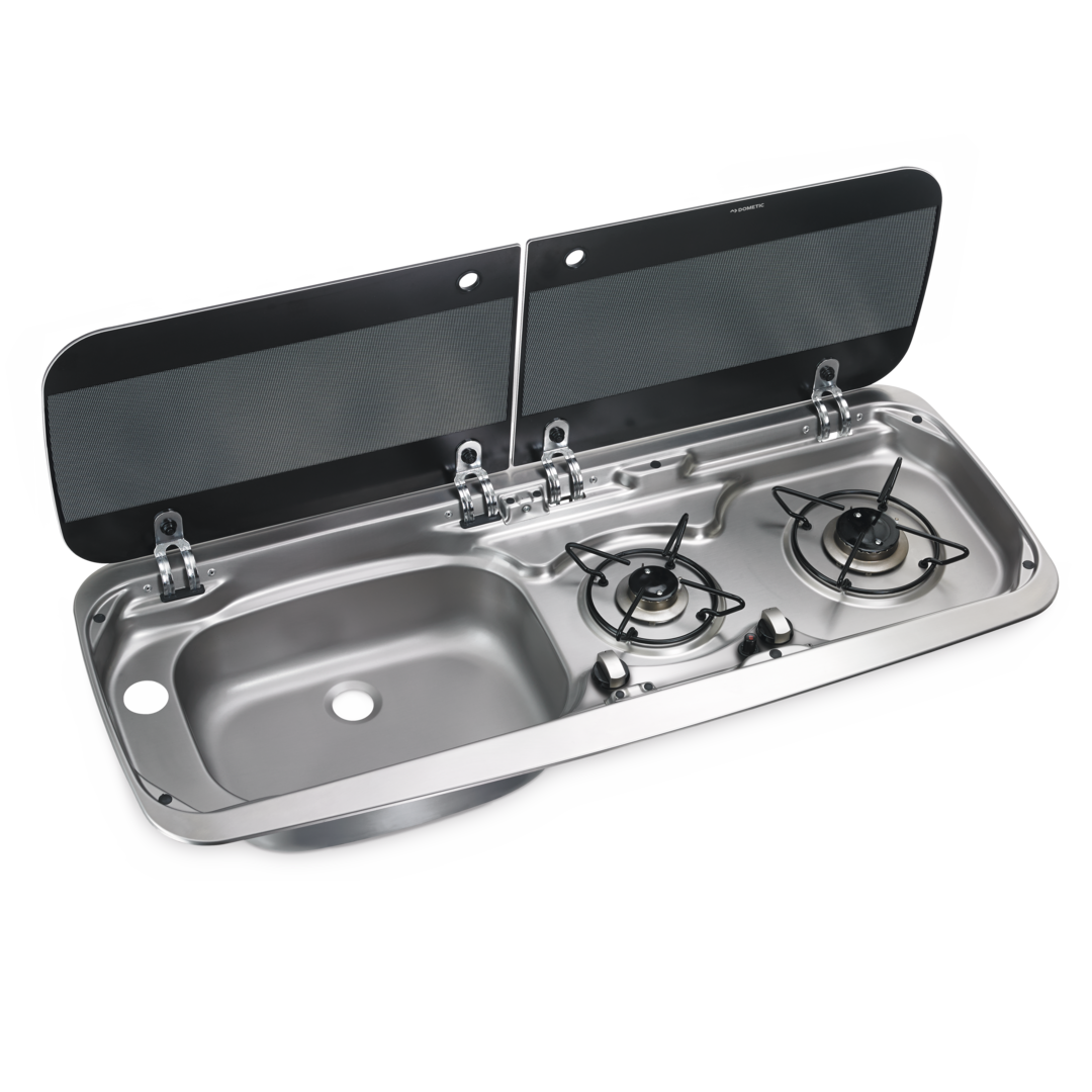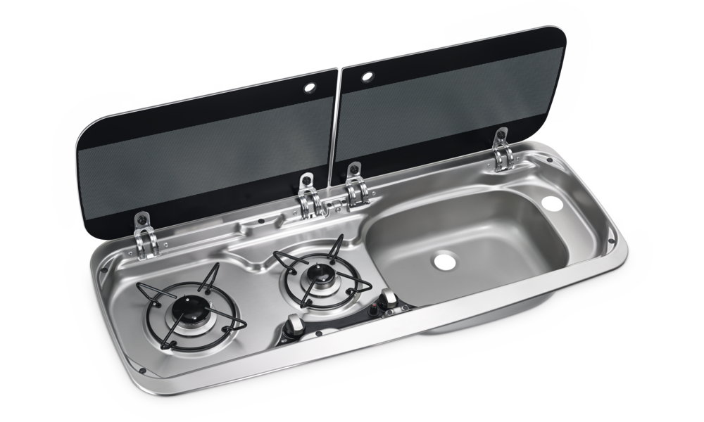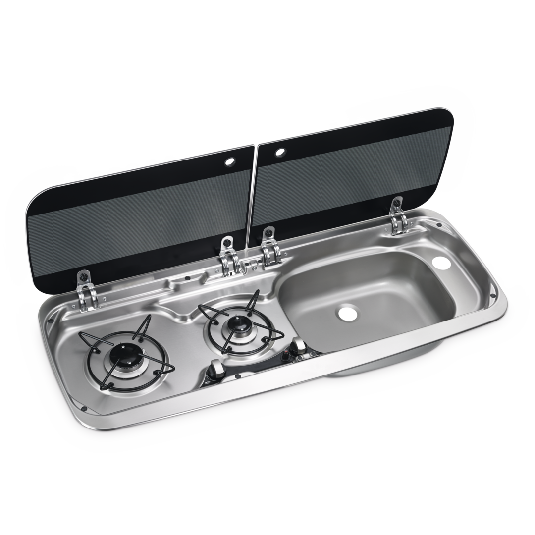 Kombination aus 2-flammigem Kochfeld und Spüle mit Glasdeckel.