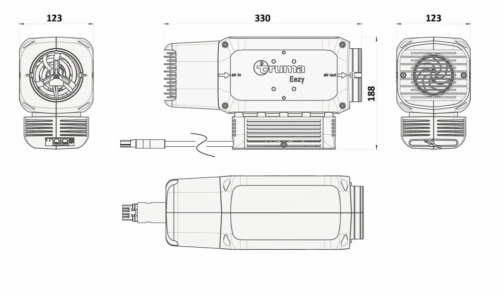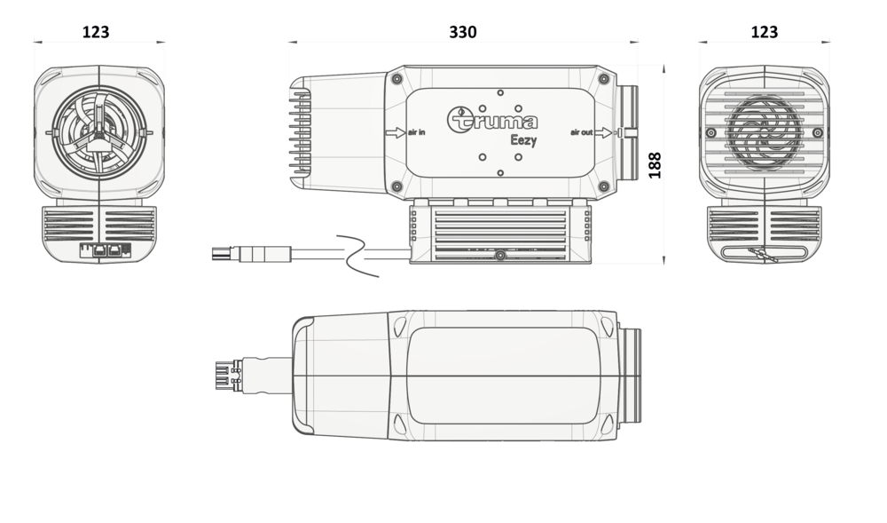 Die Heizung arbeitet mit 230 V AC Landstrom. Damit werden zwei Heizspiralen mit je 900 W betrieben. Die Steuerung erfolgt über eine 12 V DC Spannungsversorgung, beispielsweise über die Fahrzeugbatterie. Die Raumluft wird von einem integrierten Gebläse angesaugt, bei Bedarf durch die Heizspiralen erwärmt und durch die optionalen Warmluftrohre wieder in den Wohnraum geleitet. Als reine E-Heizung ermöglicht es Eezy emissionsfrei zu heizen und von Strompauschalen auf dem Campingplatz zu profi tieren. Eezy kann im Gegensatz zu handelsüblichen Elektroheizungen im Möbelbau integriert in das Fahrzeug eingebaut werden und ist speziell für Freizeitfahrzeuge zugelassen. Dadurch ist ein sicherer Betrieb gewährleistet. Eezy ist zudem sehr kompakt, benötigt im Gegensatz zu Gas- oder Dieselheizungen keinen Abgaskamin und kann schnell und einfach eingebaut oder nachgerüstet werden. Zudem wird die E-Heizung mit vormontiertem Stecker geliefert, was die Montage weiter vereinfacht.