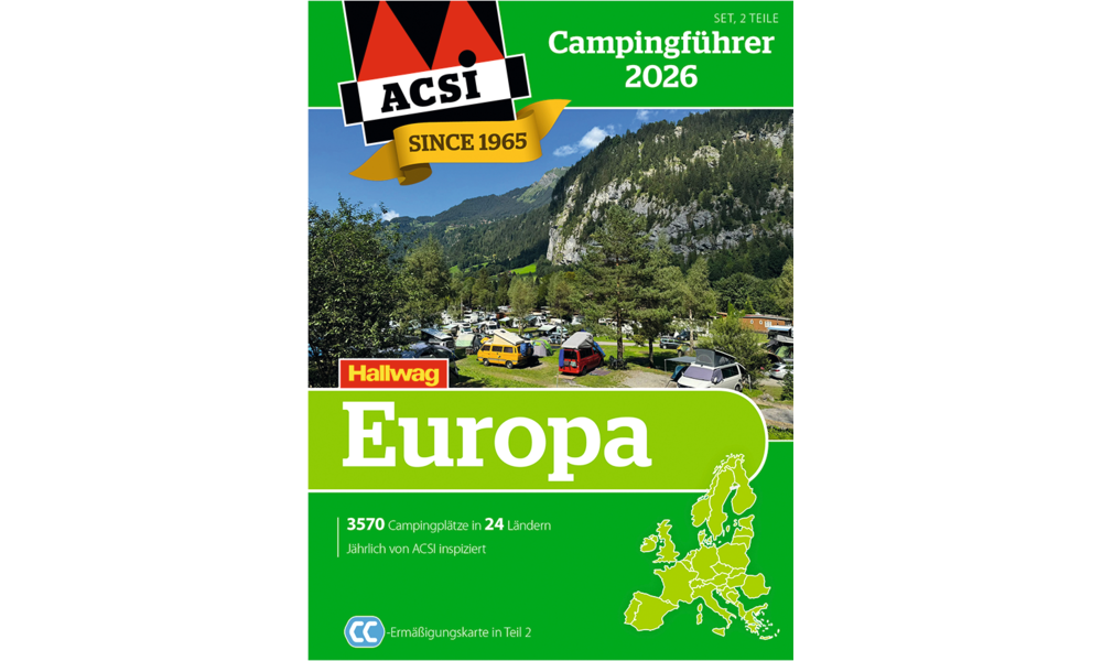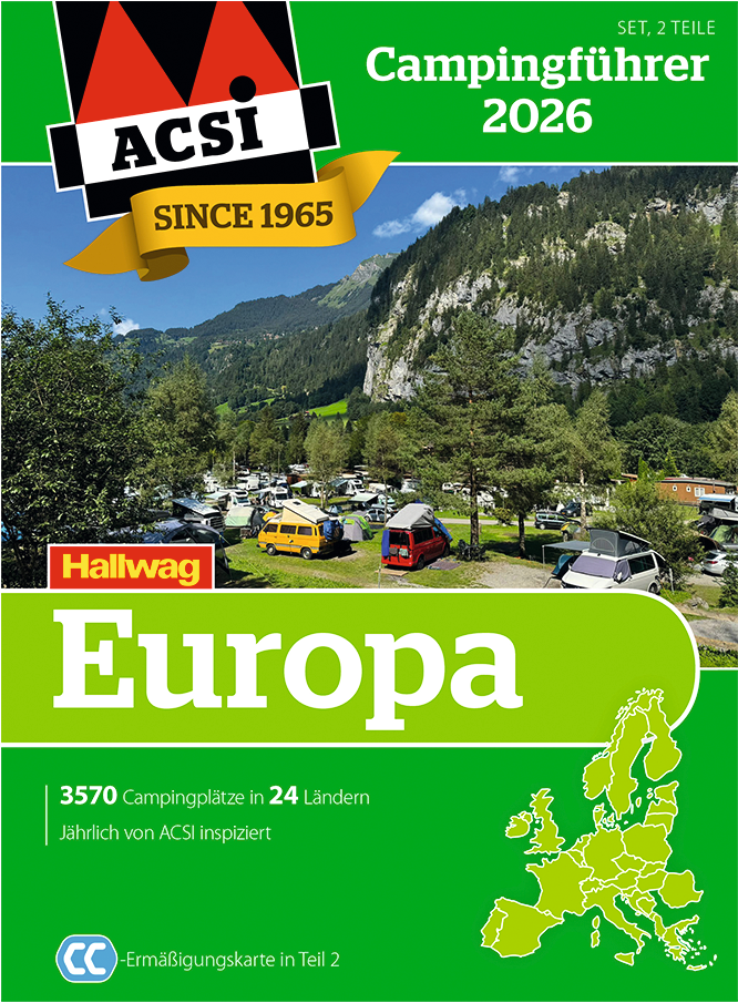 - einen Rabattgutschein über 50% für den Jahres-Zugang zur ACSI Camping Europa-App mit allen Campinginformationen**