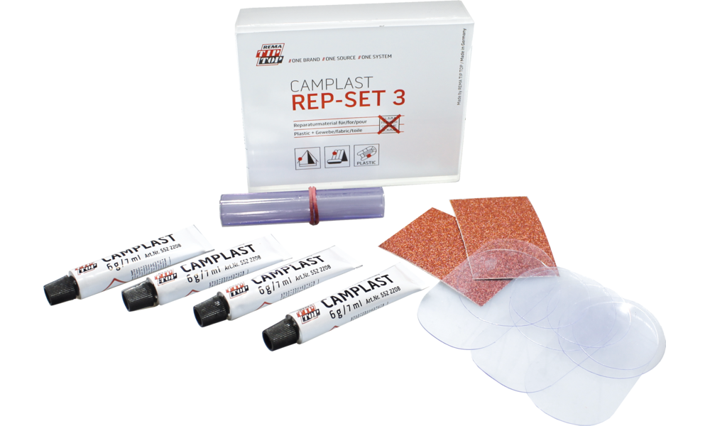 Camping und Freizeit Reparaturset für Gewebe, Gewebeoberflächen, Plastik- und Folienartikel.