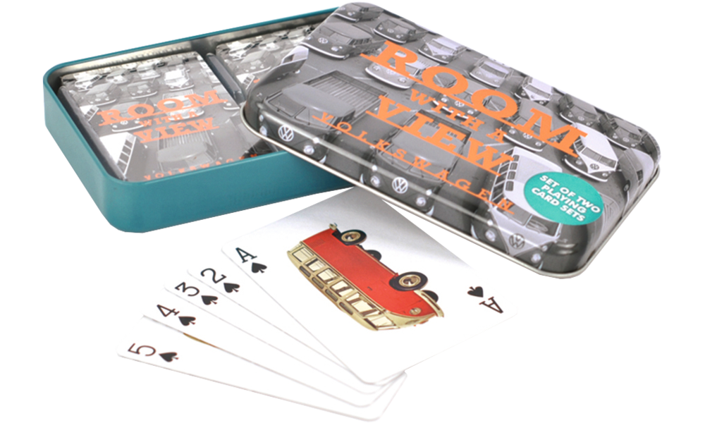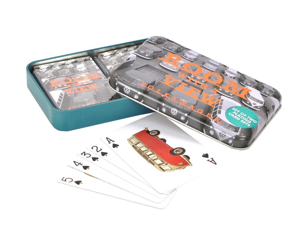 Spielkarten Set mit Retro-Bulli-Motiv in praktischer Metalldose für unterwegs oder für einen lustigen Spieleabend zu Hause.