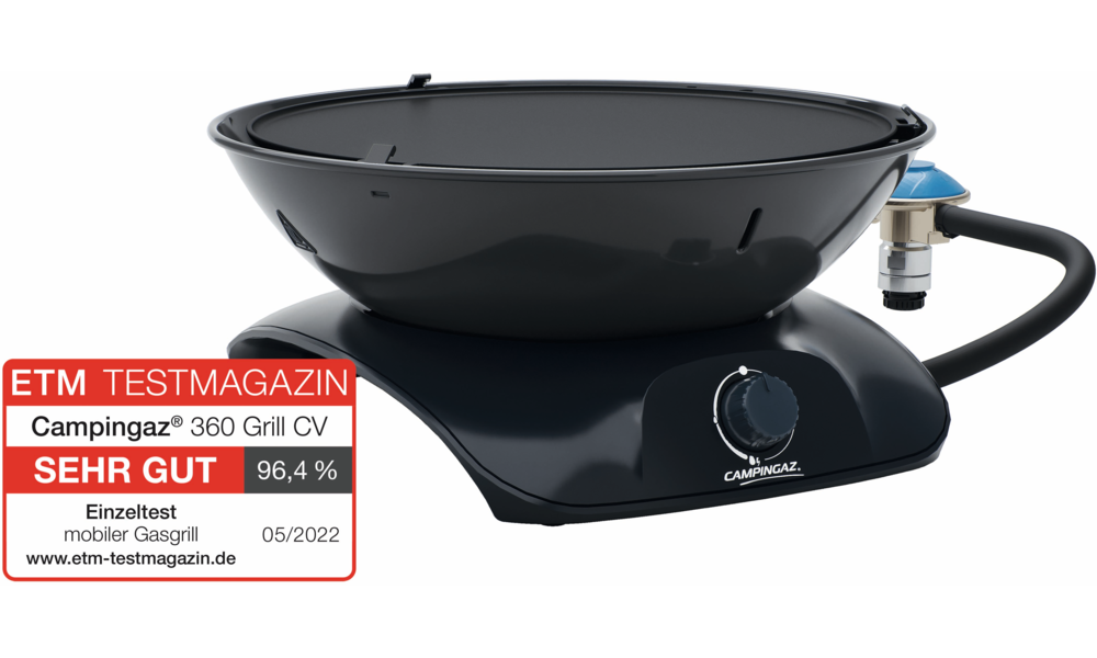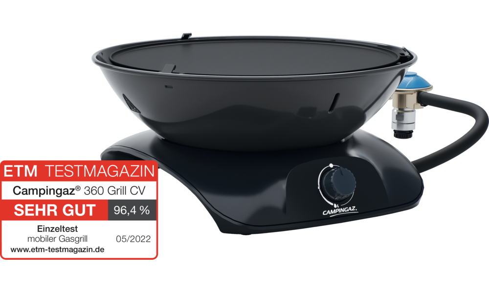 Lieferumfang inklusive Schutzdeckel, Tragetasche, Schlauch und Regler. Grillfläche ø 899 cm² (ø 30 cm). Leistung 2,2 kW, Gasverbrauch 175 g/h. Brenndauer mit CV 470 Plus 2 h 30 min.