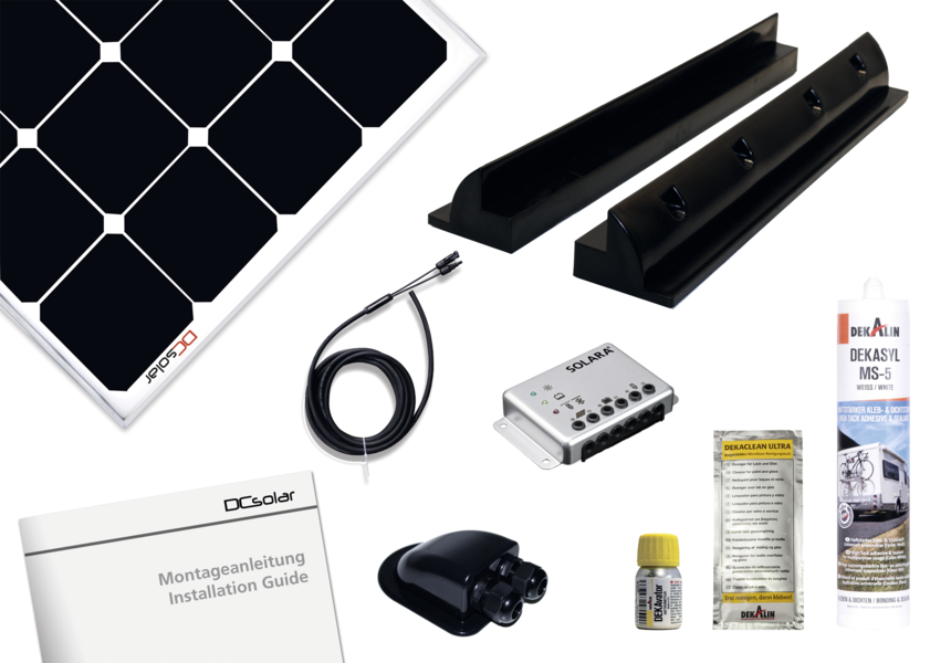Alles geliefert in einem Karton: Modul(e) der Power E-Serie, Solara Laderegler SR280E, 16 A, ABS-Haltespoilerset(s), Dachdurchführung, Klebeset Fix Pack, Anschlusskabel, Montageanleitung.