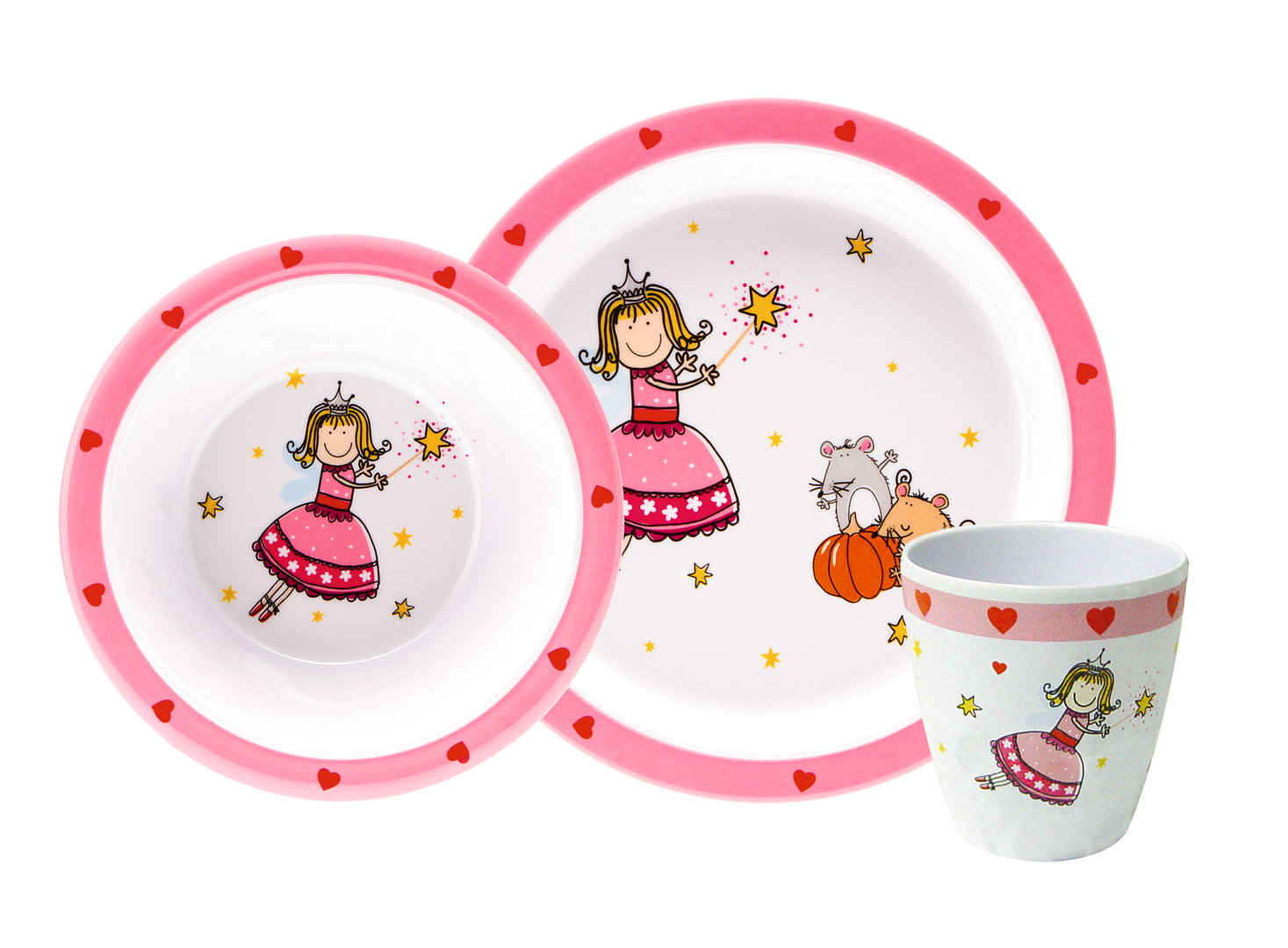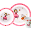 Kindergeschirrsets. Robuste und lebensmittelechte Kindergeschirrsets aus Melamin. Mit lustigen, farbenfrohen Designs. 3-teilig, bestehend aus Essteller, Dessertteller und Trinkbecher. Geschirr ist bruchunempfindlich und spülmaschinengeeignet. Nicht mikrowellengeeignet. TÜV geprüft. Nur solange Vorrat reicht!