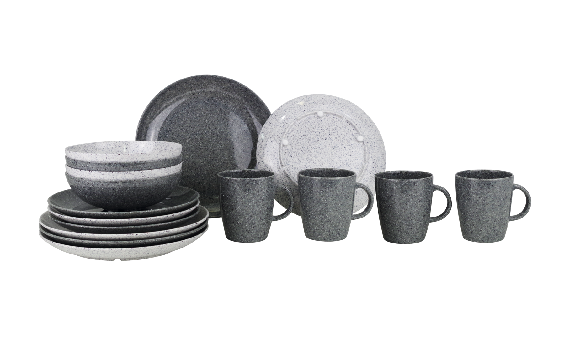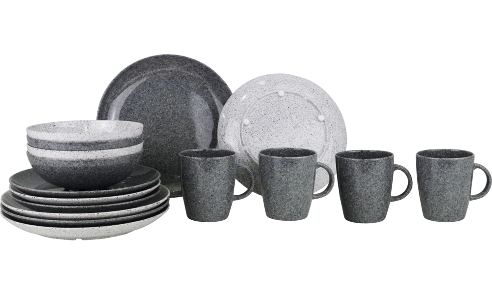 Melamin-Set Classic Line GRANITE. 16-teiliges Geschirrset bestehend aus 4 Esstellern, 4 Desserttellern, 4 Schüsseln und 4 Henkelbechern. Nur solange Vorrat reicht!