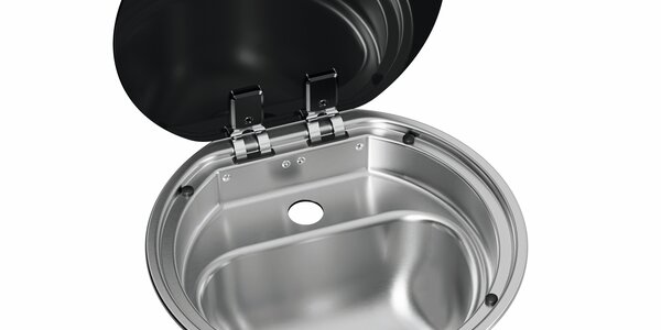 Dometic SNG 4244. Spülbecken eckig mit Abdeckung aus temperaturbeständigem Sicherheitsglas, Siphon, Gummidichtung, mit Bohrung für Wasserhahn (ø 39 mm).