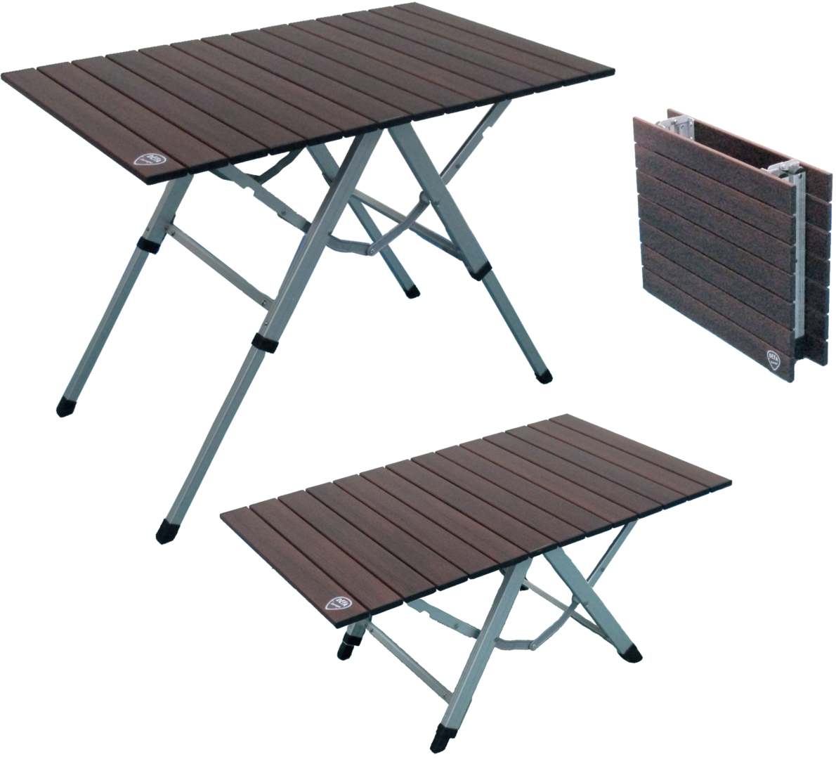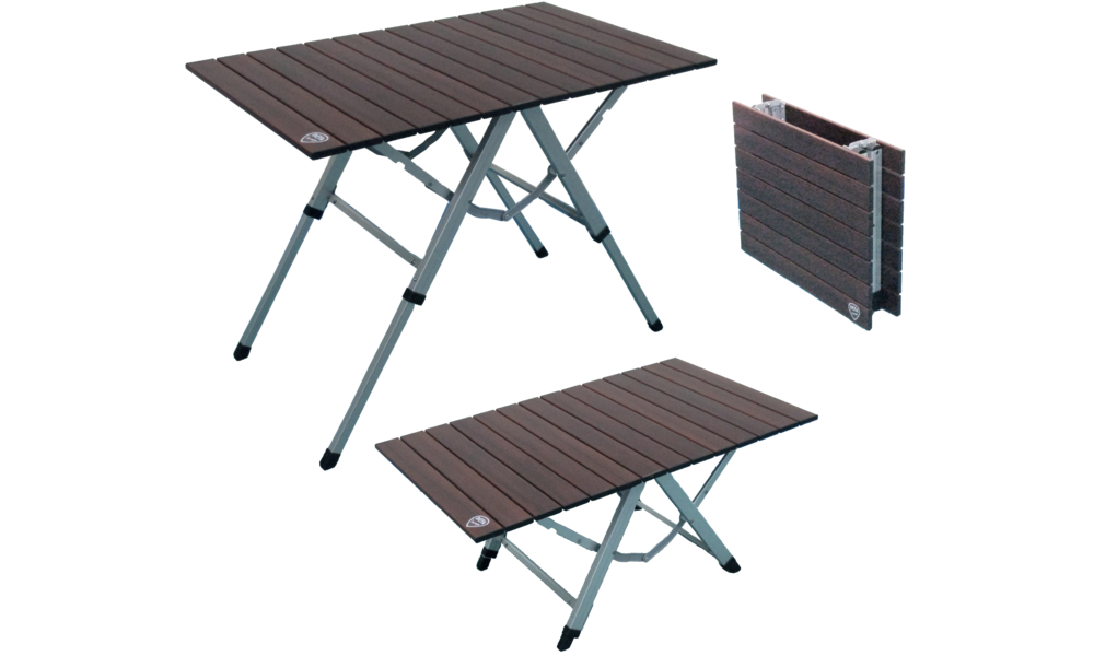 Schnell klappbar, mit Aluminiumtischplatte aus Holzdekor, höhenverstellbar zwischen 35 cm und 60 cm.