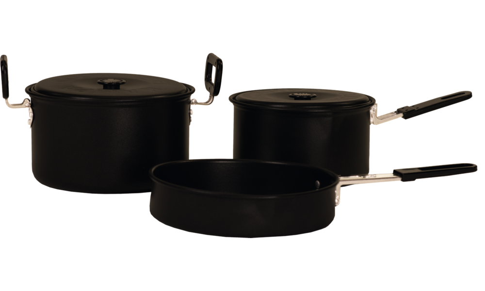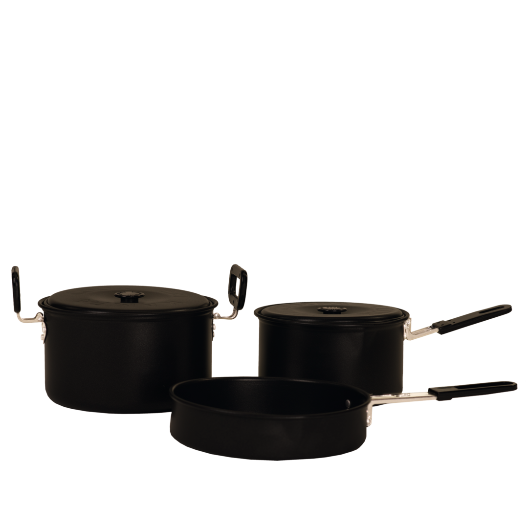 Töpfe aus hochwertigem Aluminium. Jeder Topf hat einen eigenen stabilen Griff. Set bestehend aus 1 Topf (øxH) 16 x 10 cm, 1 Topf (øxH) 14 x 7 cm, 1 Pfanne (øxH) 17 x 4 cm, 3 Siebdeckeln und praktischer