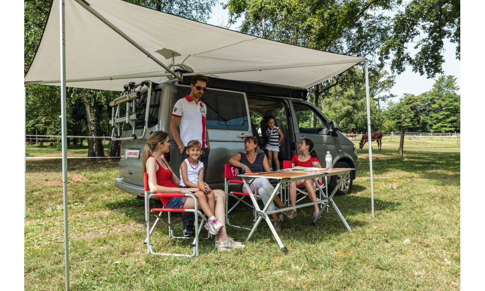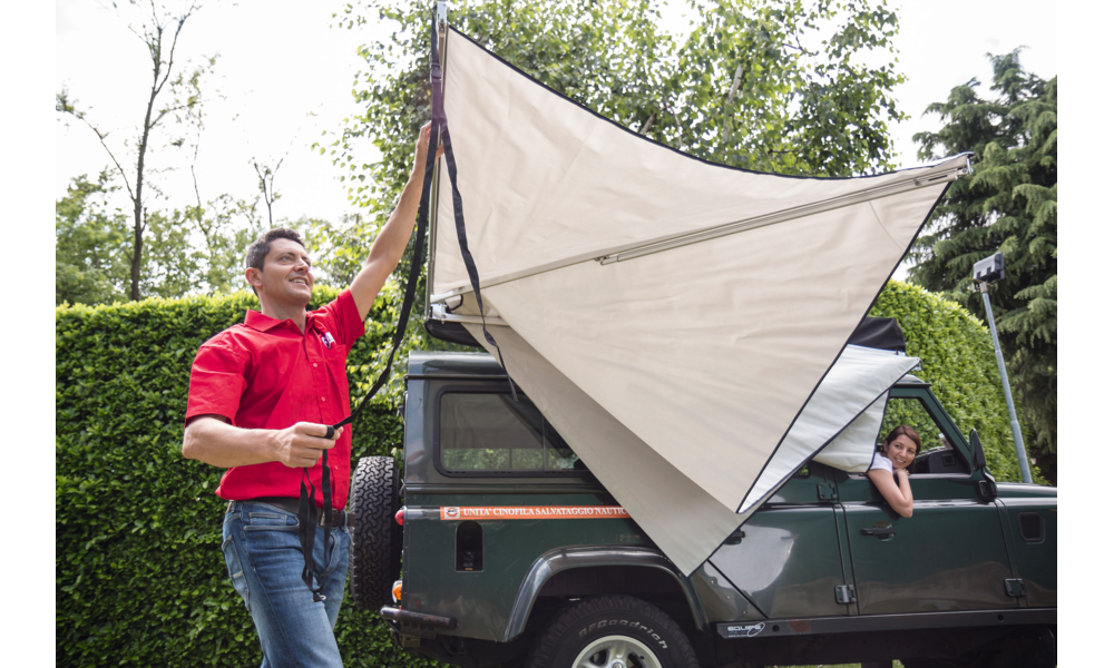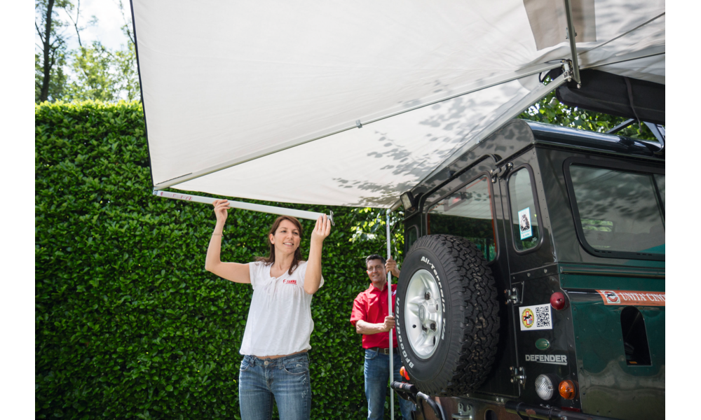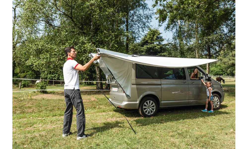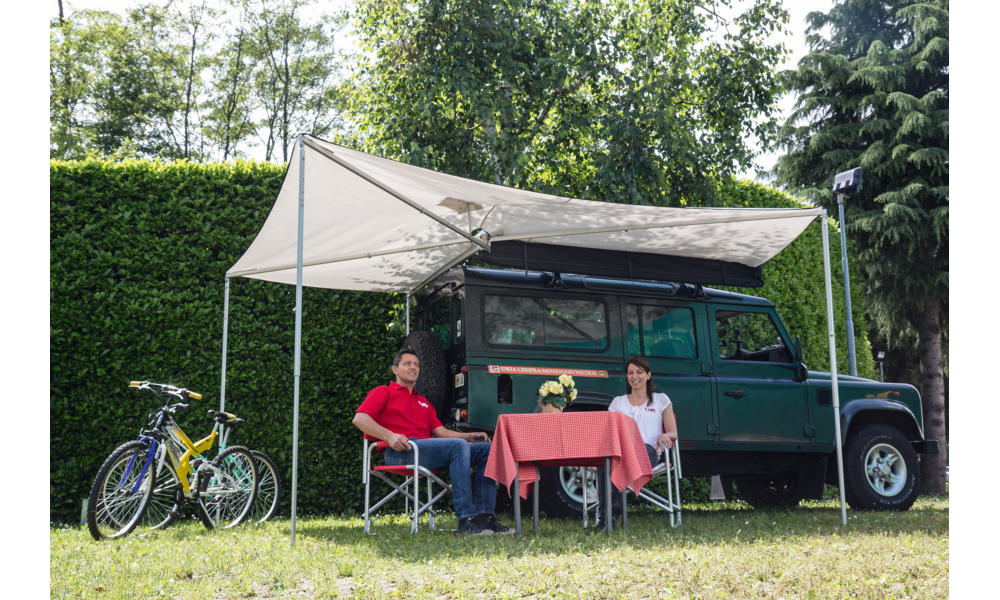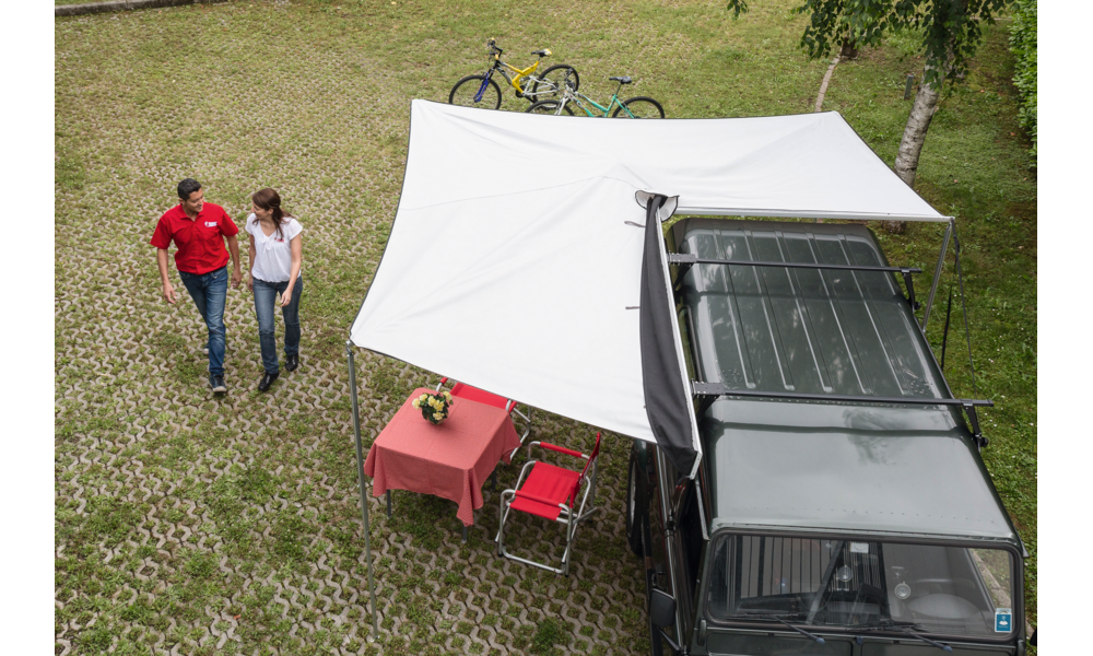 Die leichte Markise, die sich um das Fahrzeug schmiegt und auf 270° Schutz vor der Sonne bietet.