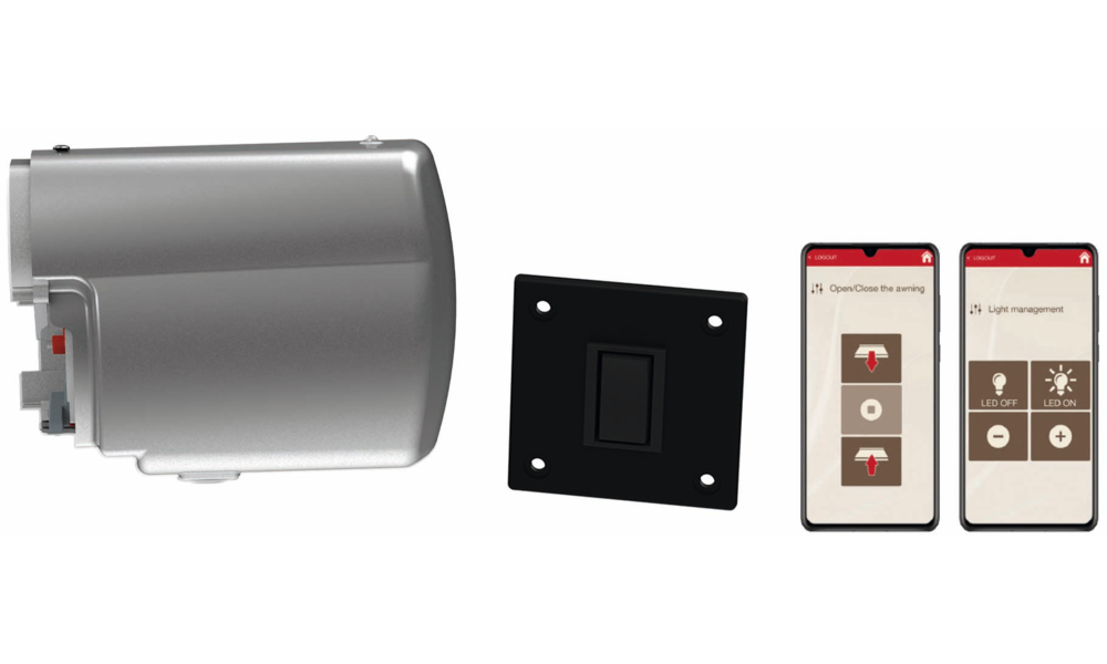 Praktische Fiamma-App (Android und iOS) zur Steuerung der Markise: Öffnen und Schließen, LED-Steuerung (an/aus/dimmen).