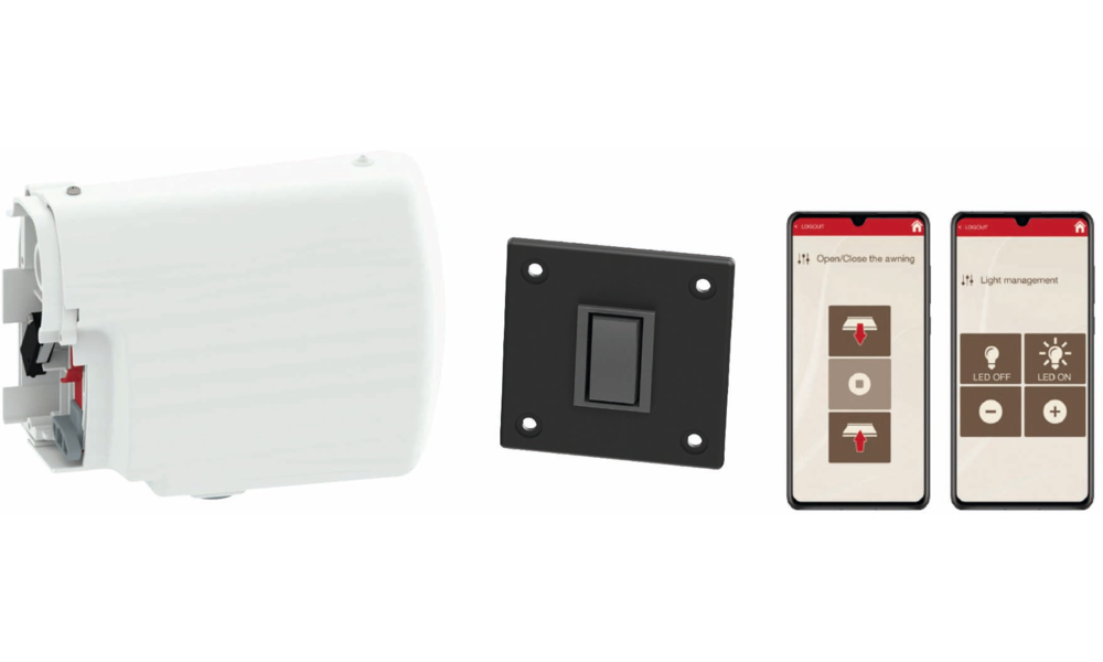 Praktische Fiamma-App (Android und iOS) zur Steuerung der Markise: Öffnen und Schließen, LED-Steuerung (an/aus/dimmen).