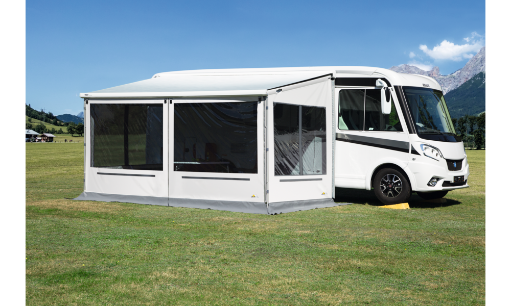 Das Wandsystem Rain Outside bietet vielseitige Möglichkeiten, wie unterhalb der Markise eine geschützte Fläche entstehen kann.
