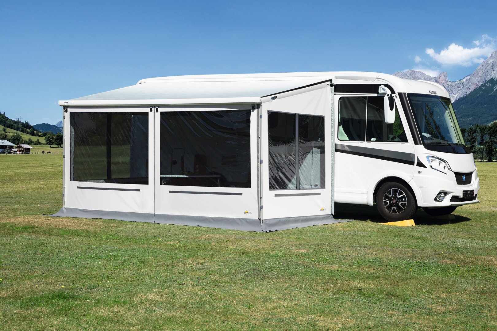 Das Wandsystem Rain Outside bietet vielseitige Möglichkeiten, wie unterhalb der Markise eine geschützte Fläche entstehen kann.