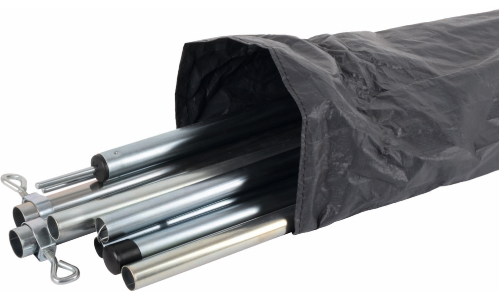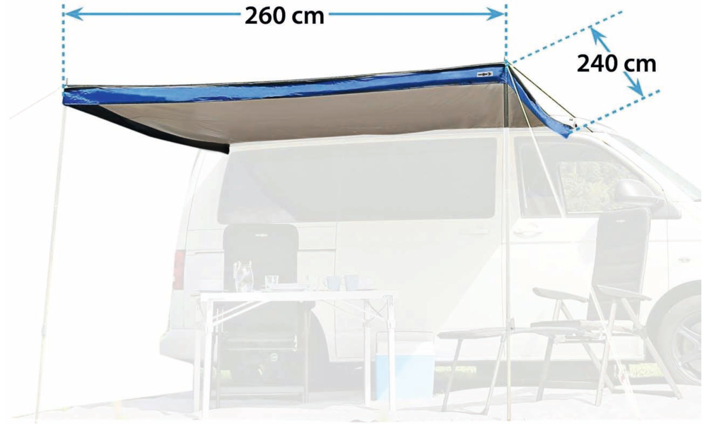 Sonnenvordach für Busse. Die Befestigung am Fahrzeug erfolgt entweder über die Kederschiene oder den mitgelieferten Schleusenstab.