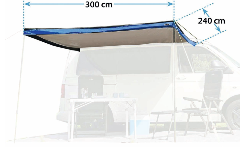 Sonnenvordach für Busse. Die Befestigung am Fahrzeug erfolgt entweder über die Kederschiene oder den mitgelieferten Schleusenstab.