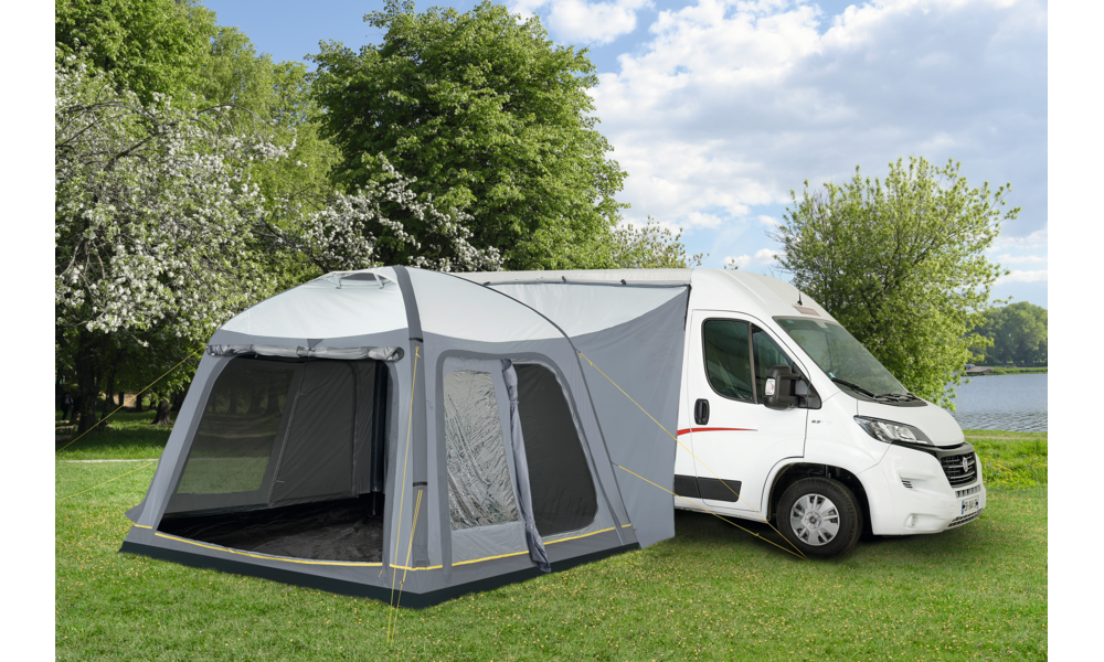 Besondere Merkmale: in Wohnraum eingenähter Zeltboden, Moskitonetze an allen Türen, Trenntür zwischen Schleuse und Wohnraum, Belüftung oben, an der 350 cm breiten Frontseite sorgt dafür, dass Sie es tagsüber schön hell und freundlich haben. Dieses Vorzelt ist leicht, robust und zugleich modern. Für Fahrzeuge mit einer Anschlusshöhe von 180-240 cm.